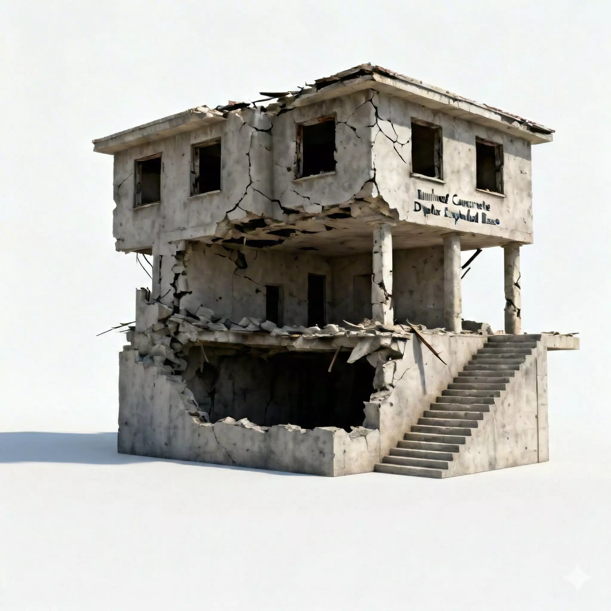 The Overall ConceptThis asset is a high-impact centerpiece for any tactical battlefield or post-apocalyptic city block. It is a realistic 3D model of a two-story concrete building featuring extensive combat damage and a functional external staircase, making it a perfect hero prop for military shooters and survival simulators.