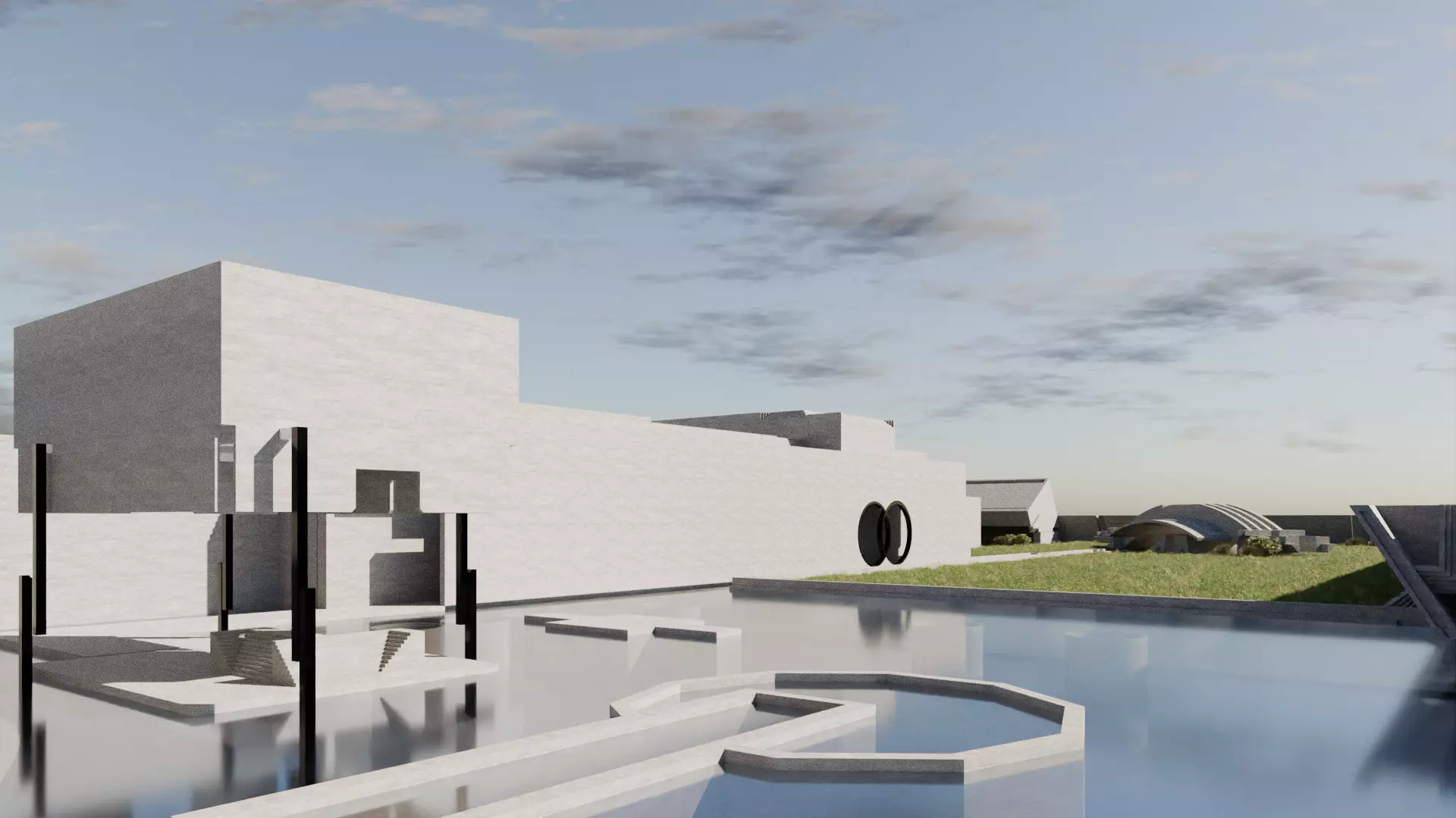 - Il padiglione della meditazione si presenta come una scatola a cui è stata tagliata via la parte inferiore, appare quindi come sospeso nell'aria e sull'acqua. In realtà è sorretto da esili montanti dal profilo spezzato. Luogo magico e dalla tranquillità mistica è volutamente separato del resto del complesso mediante una porta che si abbassa e scompare nell'acqua, azionata da un complesso sistema di cavi e pulegge nascosto all'occhio del visitatore.