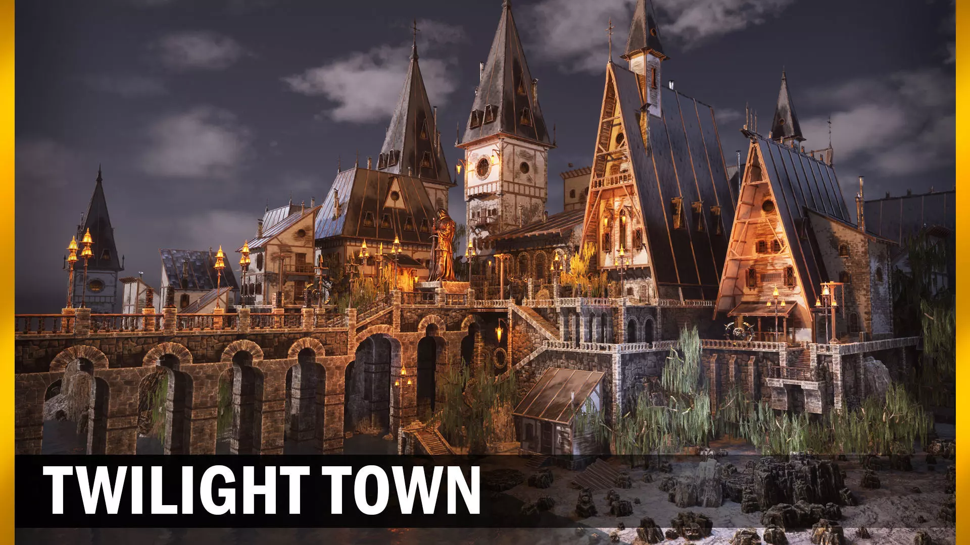 In the middle of the marshes, on the banks of a wide river, this twilight town known for its puritanical mores has settled. Who knows what its inhabitants hide behind the thick walls of their houses. In this pack you will find a construction kit consisting of many wooden, stone and metal elements, as well as a series of pre-assembled assets of buildings and decorative elements. The pack also includes five seamless materials by mixing them through the vertex colors, you can get large, detailed surfaces of walls and floors. (Water only in UE version)