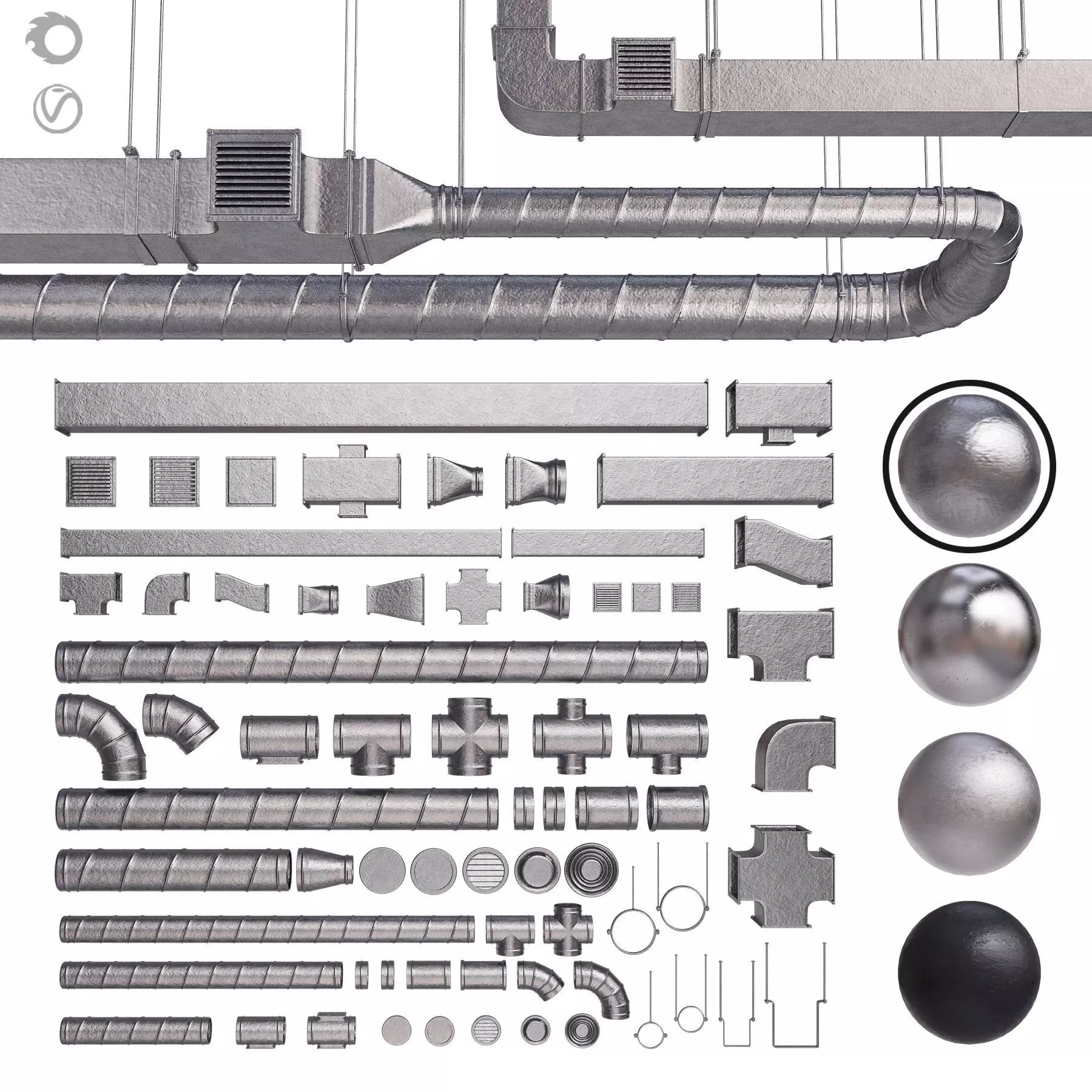 Ventilation systemThe set consists of 69 elements and 4 materialsFrom these elements, you can easily assemble many options for the location of ventilation pipesFor ease of use, the model is saved without smoothing. Due to this, you can easily change the size of the elements as you need.The kit includes round and square pipes. Corners, adapters, ventilation grilles and other elements of the ventilation system.The color of the Black Paint material can be changed to any other color in the material editor.