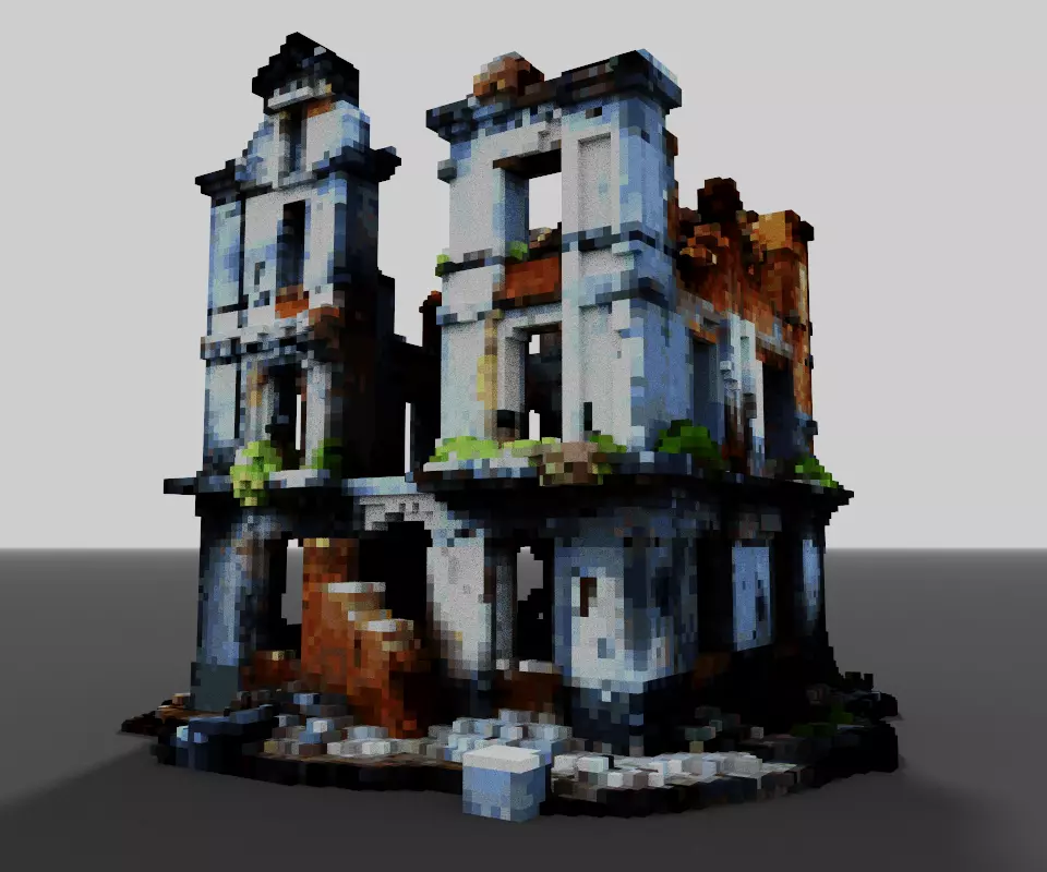 Voxel Art, 3D Pixel Art, Ruined Building, Post-Apocalyptic Asset, Abandoned House, Urban Decay, Destroyed Structure, Game Ready, Low Poly Stylized.Dystopian, Wartime, Apocalypse, Retro 3D, MagicaVoxel, Isometric Asset, Modular Building, Environmental Art, Rubble, Decayed.Voxel Model, Environment Asset, Strategy Game Prop, RPG Asset, Static Mesh, Textured Voxel, Diorama.