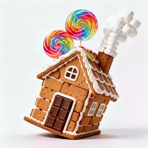 Biscuit Brick Masonry Unlike the previous cottage, the walls here are constructed from stacked rectangular biscuits (resembling graham crackers or tea biscuits) rather than flat gingerbread slabs. This gives the walls a distinct, brick-like texture with visible seams and baked edges.