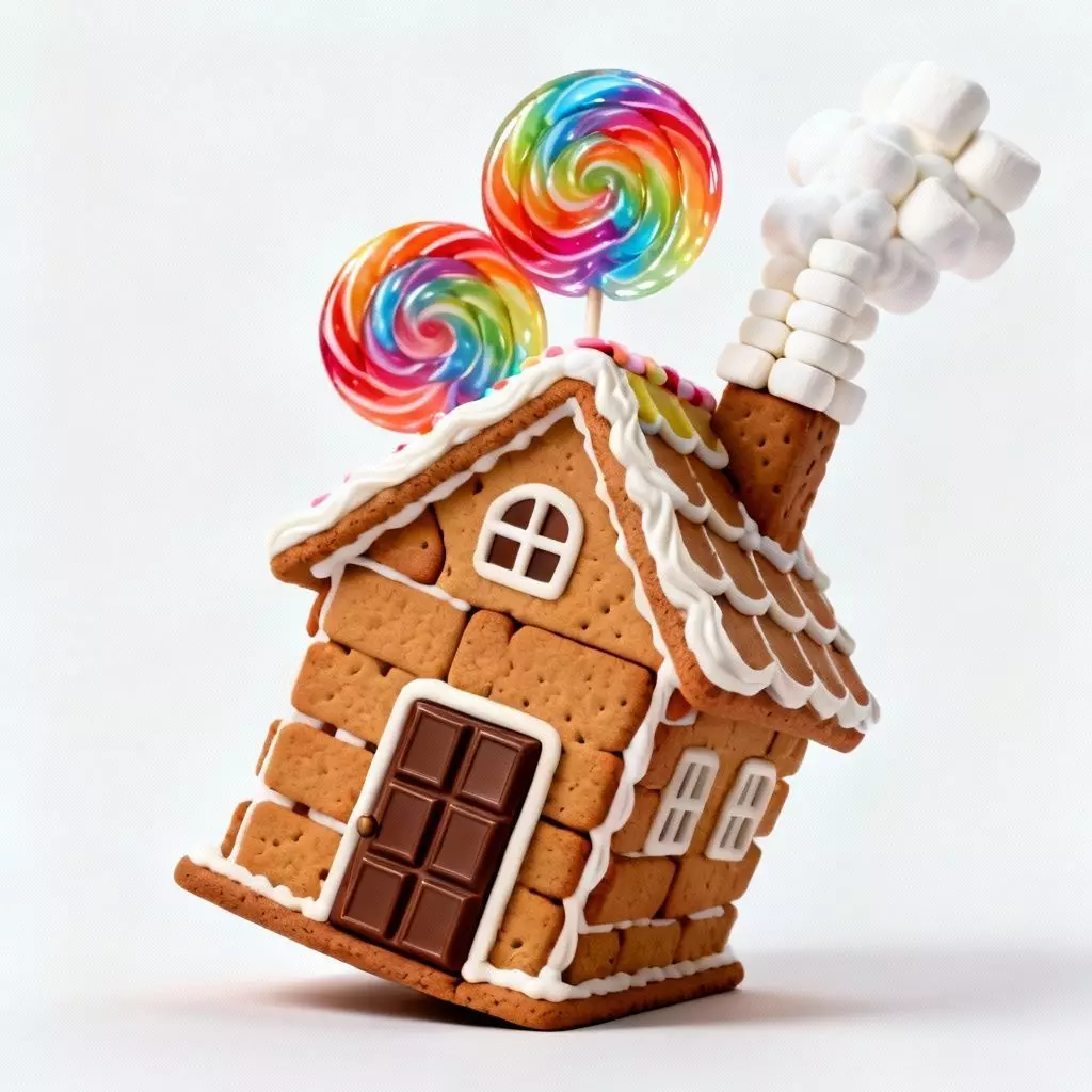 Giant Lollipop Toppers Stuck into the frosted roof are two massive rainbow swirl lollipops. These translucent, candy-colored props add significant height and vibrancy to the silhouette, breaking up the brown and white color palette.