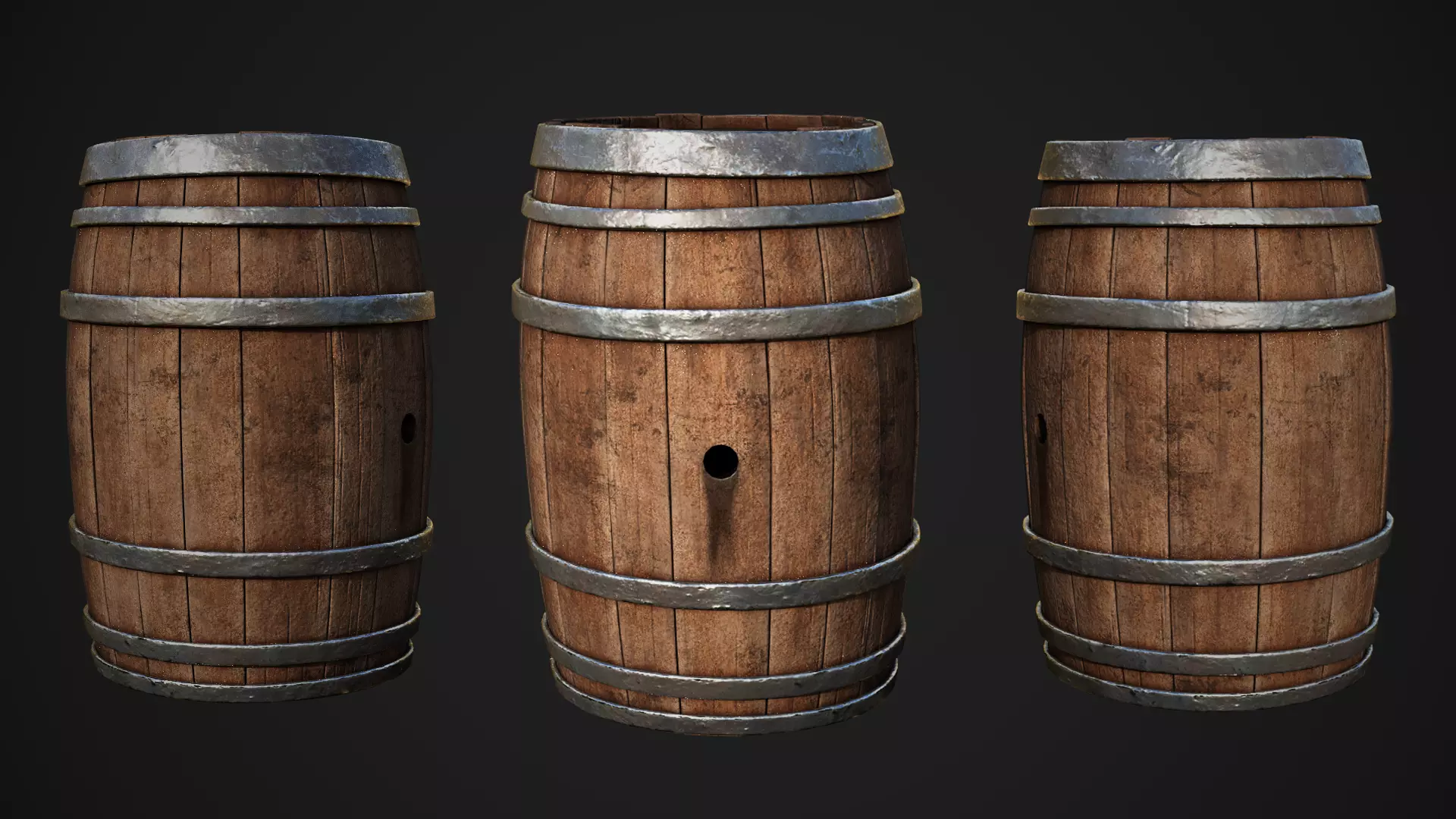 High quality realistic wooden barrel asset designed for games and real time applications. This model features detailed wood planks and worn metal bands with carefully crafted surface variation to enhance realism. The subtle roughness and color breakup give it an authentic aged appearance suitable for medieval, pirate, fantasy, and historical environments.