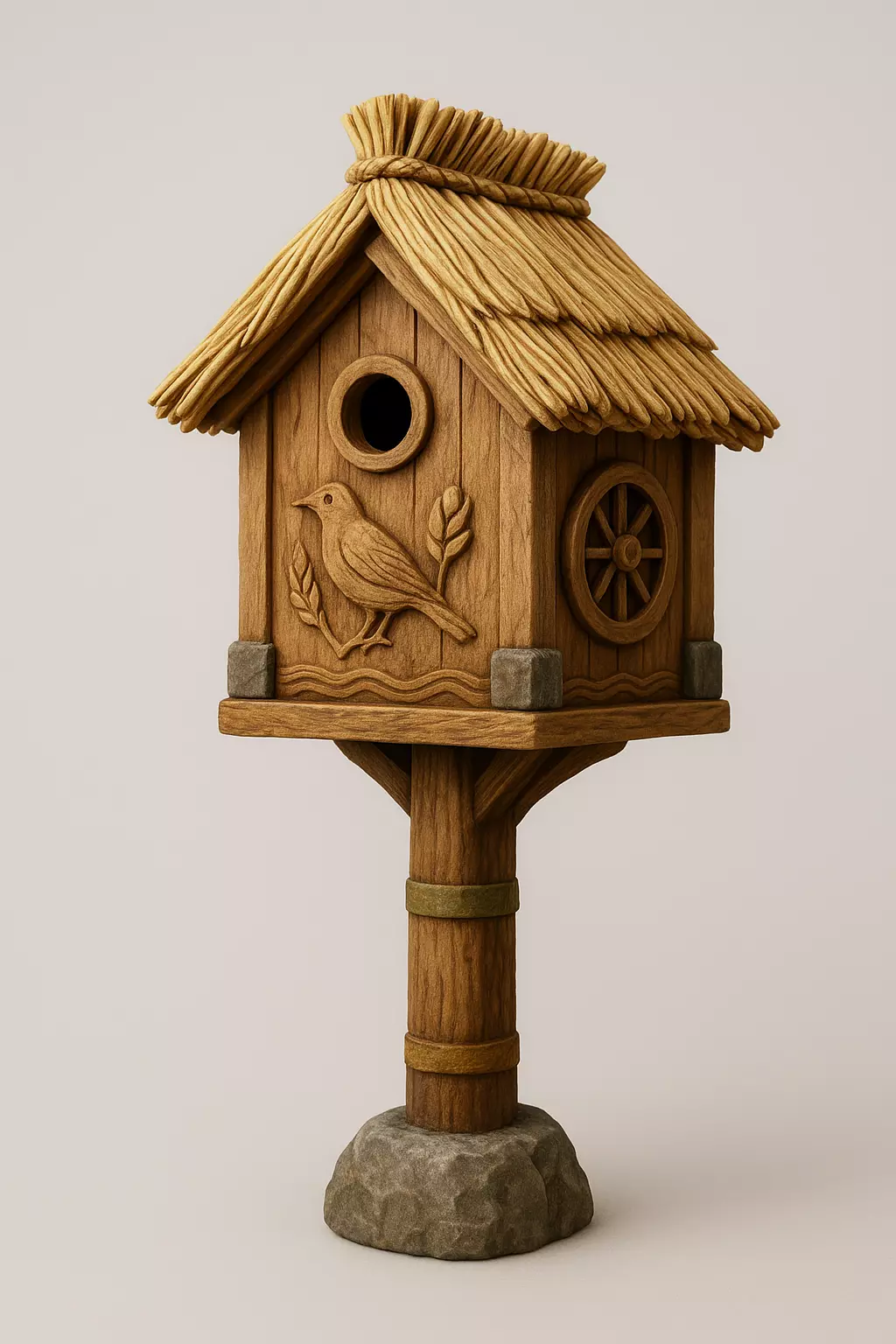 The Woodland Haven is a beautifully handcrafted 3D model inspired by rustic forest charm and natural craftsmanship. Built from finely detailed wood planks and crowned with a straw-thatched roof, this cozy birdhouse evokes the peaceful essence of woodland life. Its intricate carvings — including a perched bird motif and a circular window accent — add warmth and storytelling to the structure, making it both decorative and functional within any nature-inspired scene.