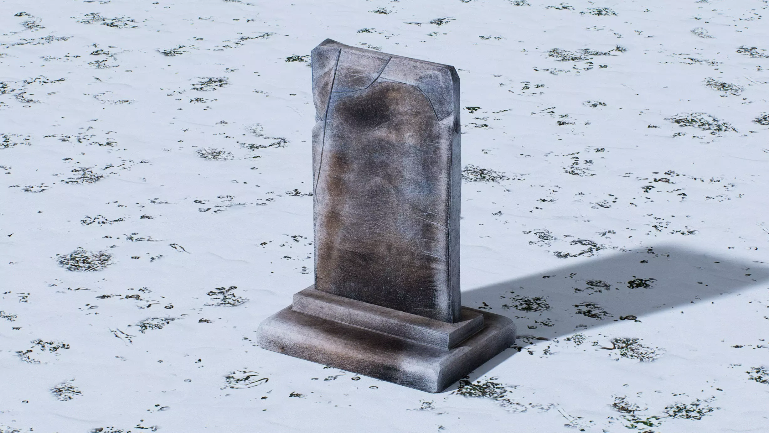 This 3D low-poly model depicts a weathered, wordless gravestone with a minimalist yet haunting design. The structure features a tall, rectangular stone slab with visible cracks and a worn texture, mounted on a simple base. Its aged appearance, accentuated by subtle shadows, evokes a sense of history and mystery, making it perfect for use in historical simulations, eerie game environments, or artistic renderings of forgotten cemeteries.