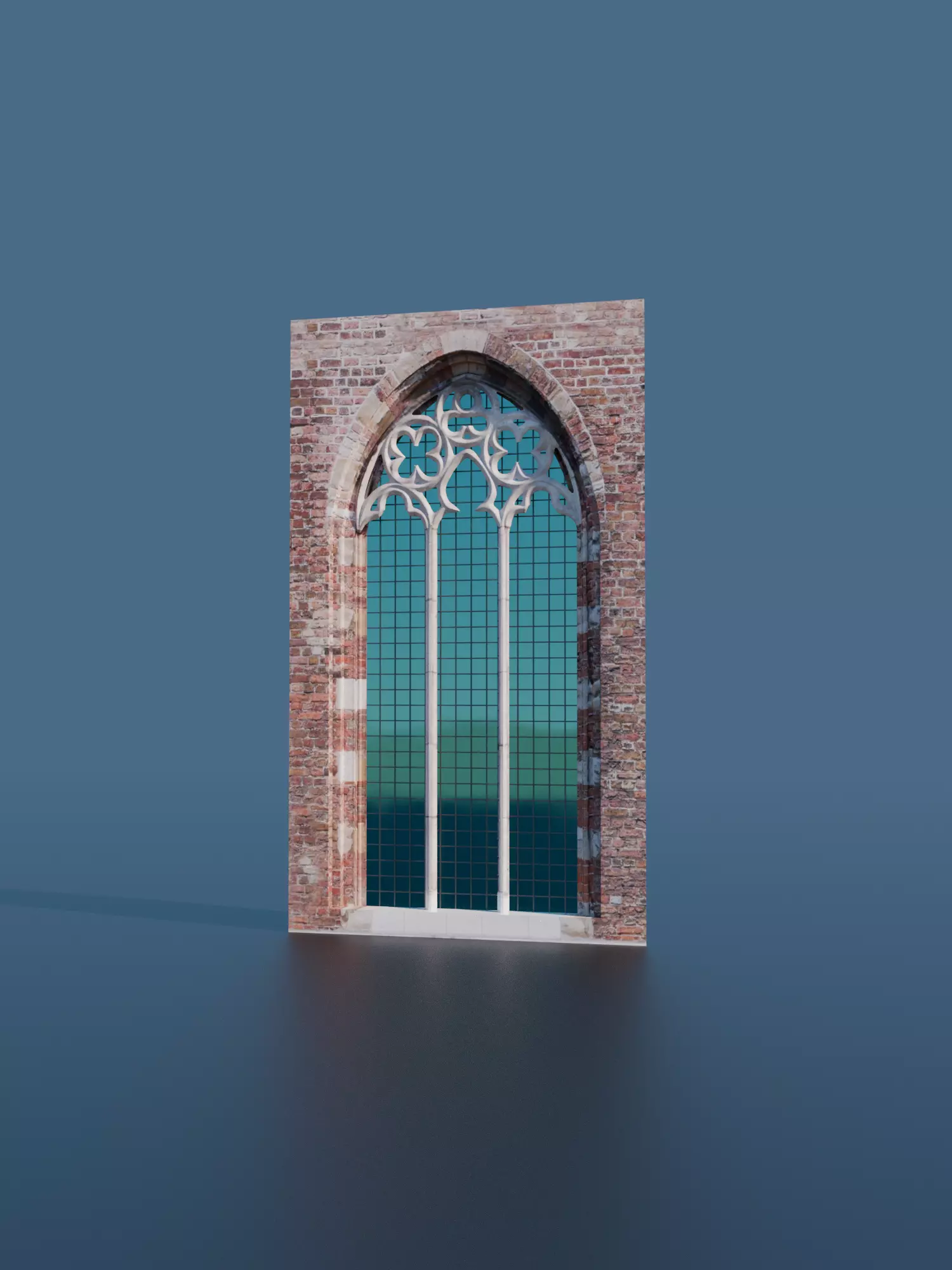 This is a high-quality 3D model of a Gothic-style arched window featuring intricate tracery and stained glass design. The model is perfect for architectural visualizations, historical reconstructions, and game environments. It is highly detailed with realistic textures, including weathered brick and stone elements surrounding the window, adding to its authentic medieval feel. The tracery patterns reflect classic Gothic architecture, characterized by flowing shapes and ornamental design, making this asset suitable for Gothic cathedrals, castles, or period-specific projects.
