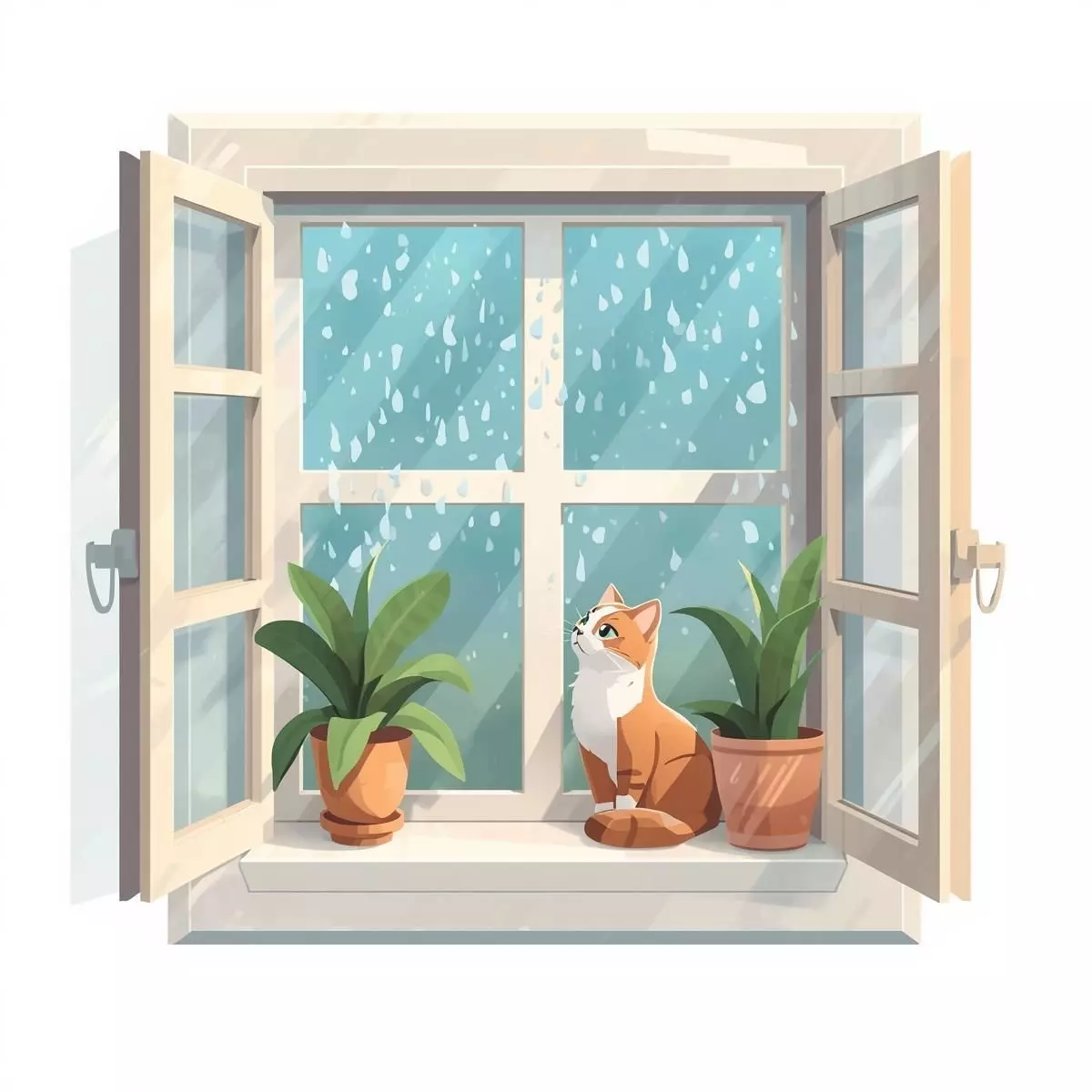 The scene includes a small ginger cat sitting patiently on the window ledge, flanked by two potted indoor plants that add a touch of vibrant green to the soft palette.