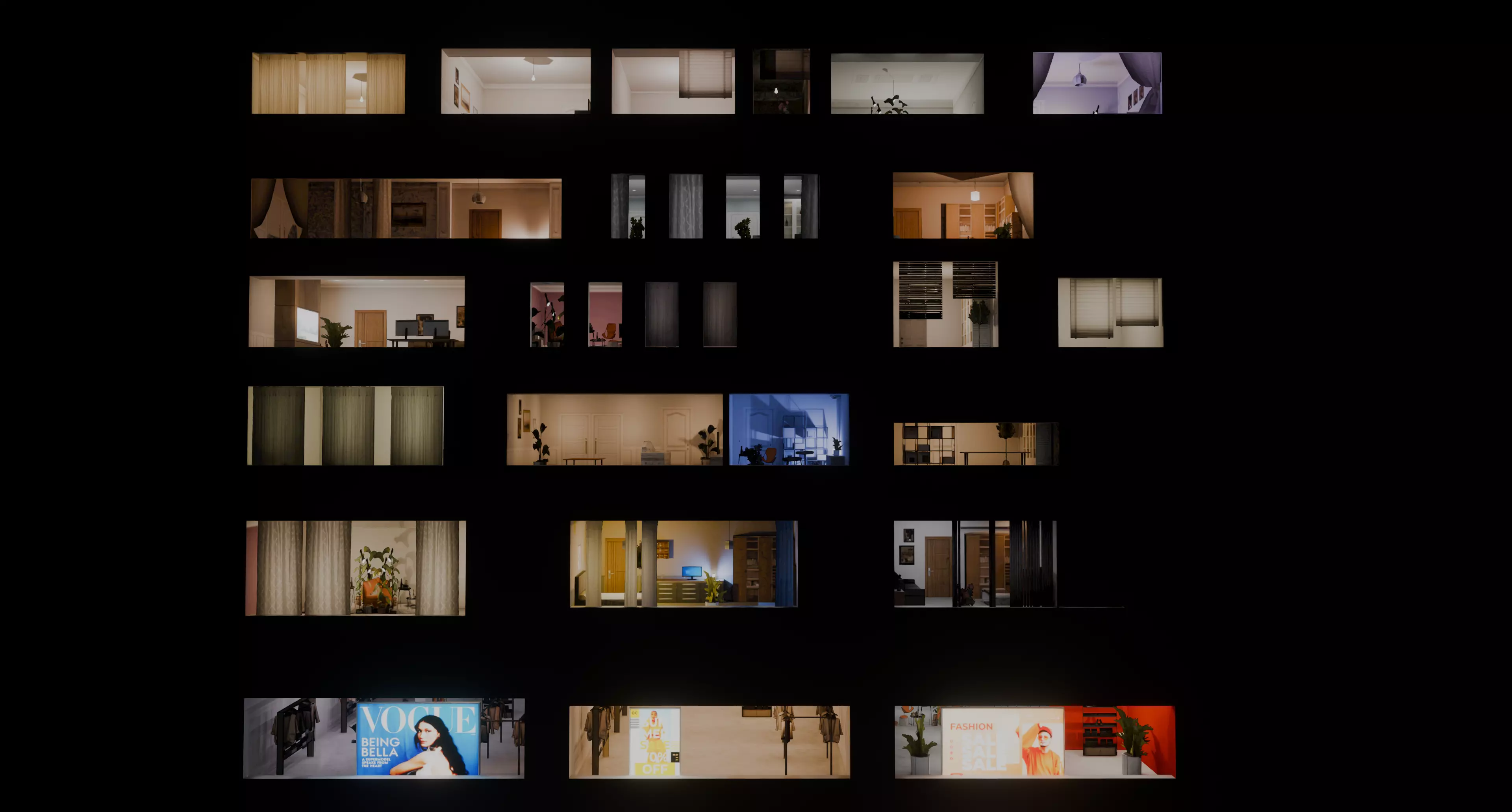 A set of residential and retail interiors, easily intergratable in scenes. Game-ready and optimised baked interiors with a variety of shapes and sizes. Includes day and night versions. The textures include 2 sets of emmisive maps included (native and light-baked)