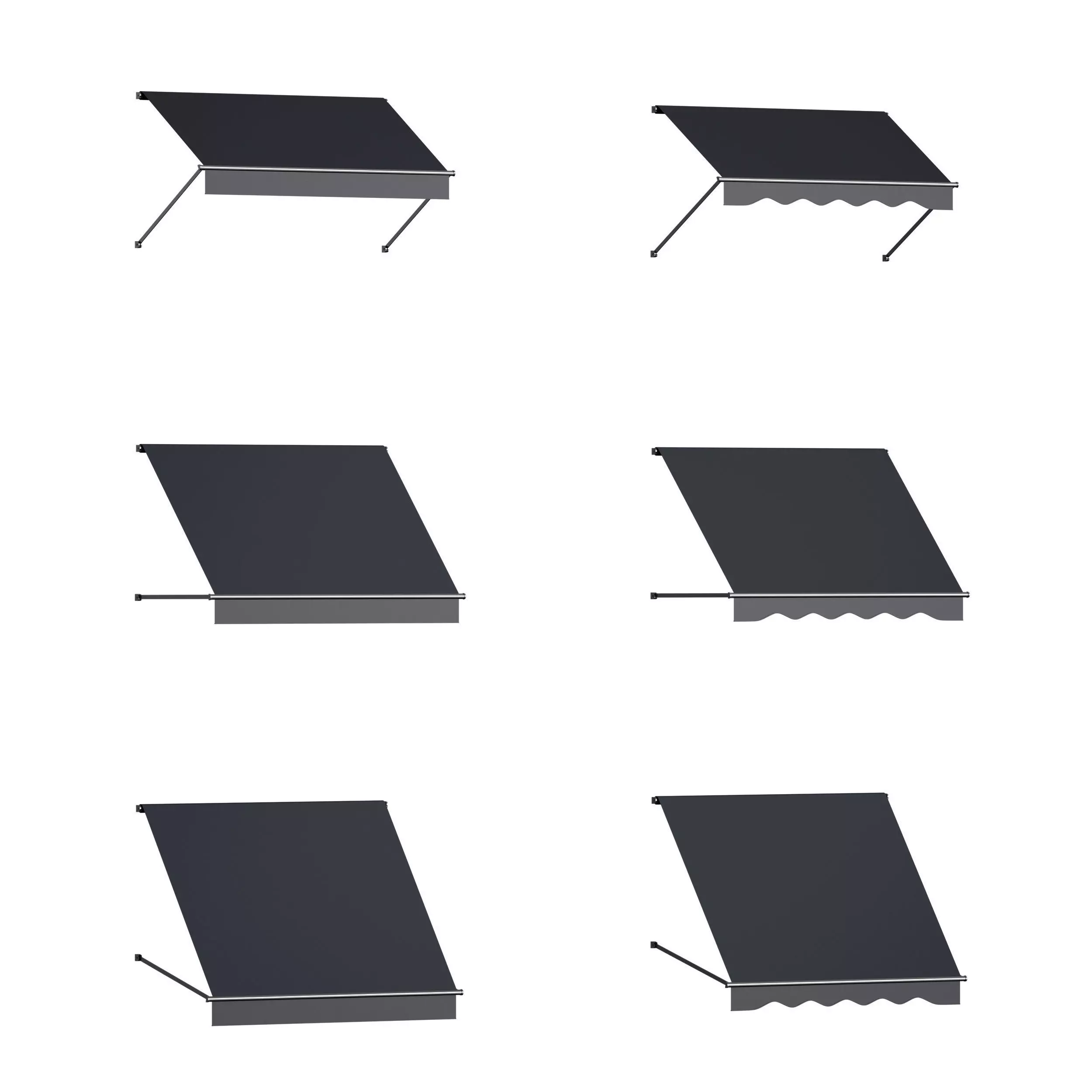 3D model of a window elbow awning in three different positions of the mechanism, with a straight and wavy edge. The frame is made of chromed metal, the fabric is black. The model is made for smoothing.
