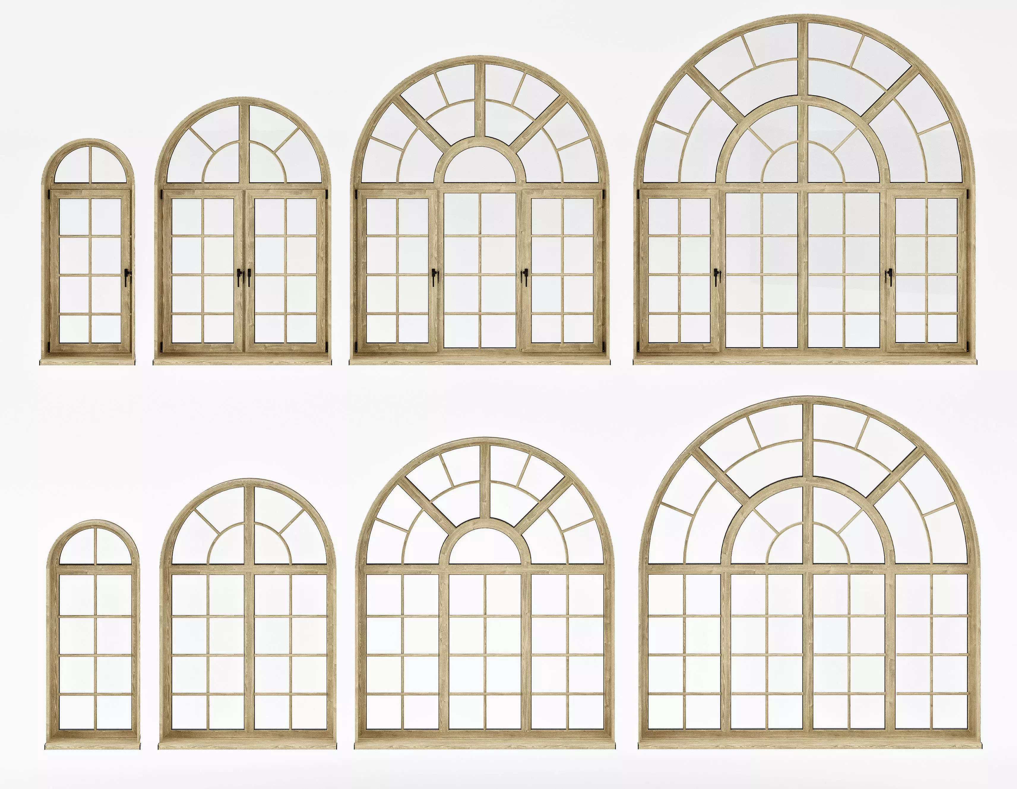 Windows in 3 wood tones (light oak, walnut, mahogany) and white aluminum.Compatible with 3ds Max (2016 and up).Materials and textures optimized for V-Ray and Corona Renderer.Includes design variations for different architectural styles. Realistic details and ready for architectural and interior visualizations.