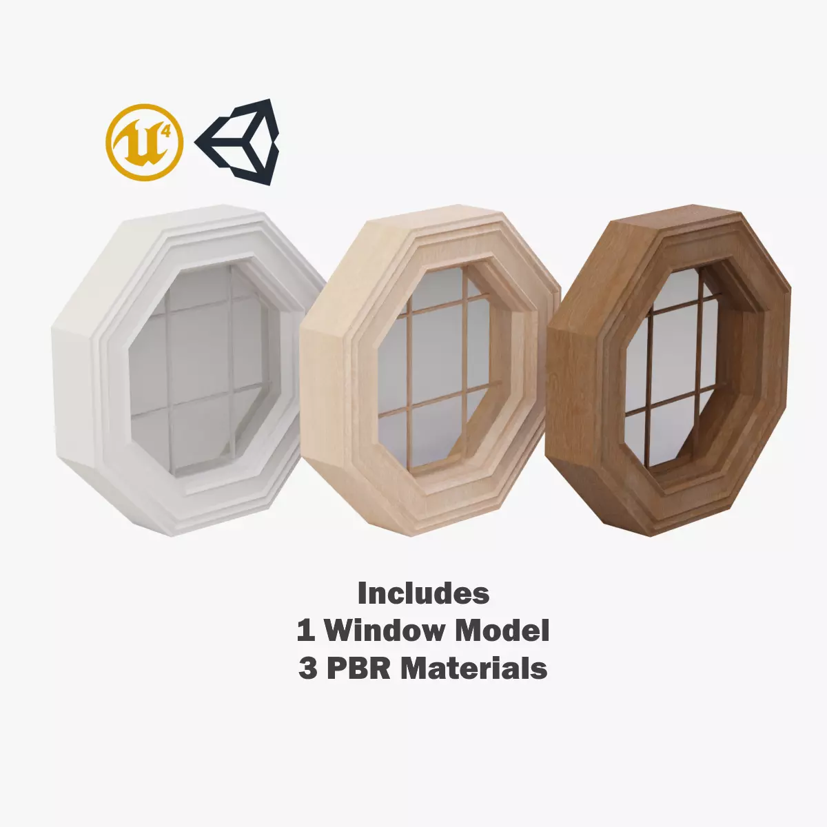 Octagon Porthole Window for architectural interior/exterior scenes. Model comes with single mesh and 3 PBR materials to pick from.