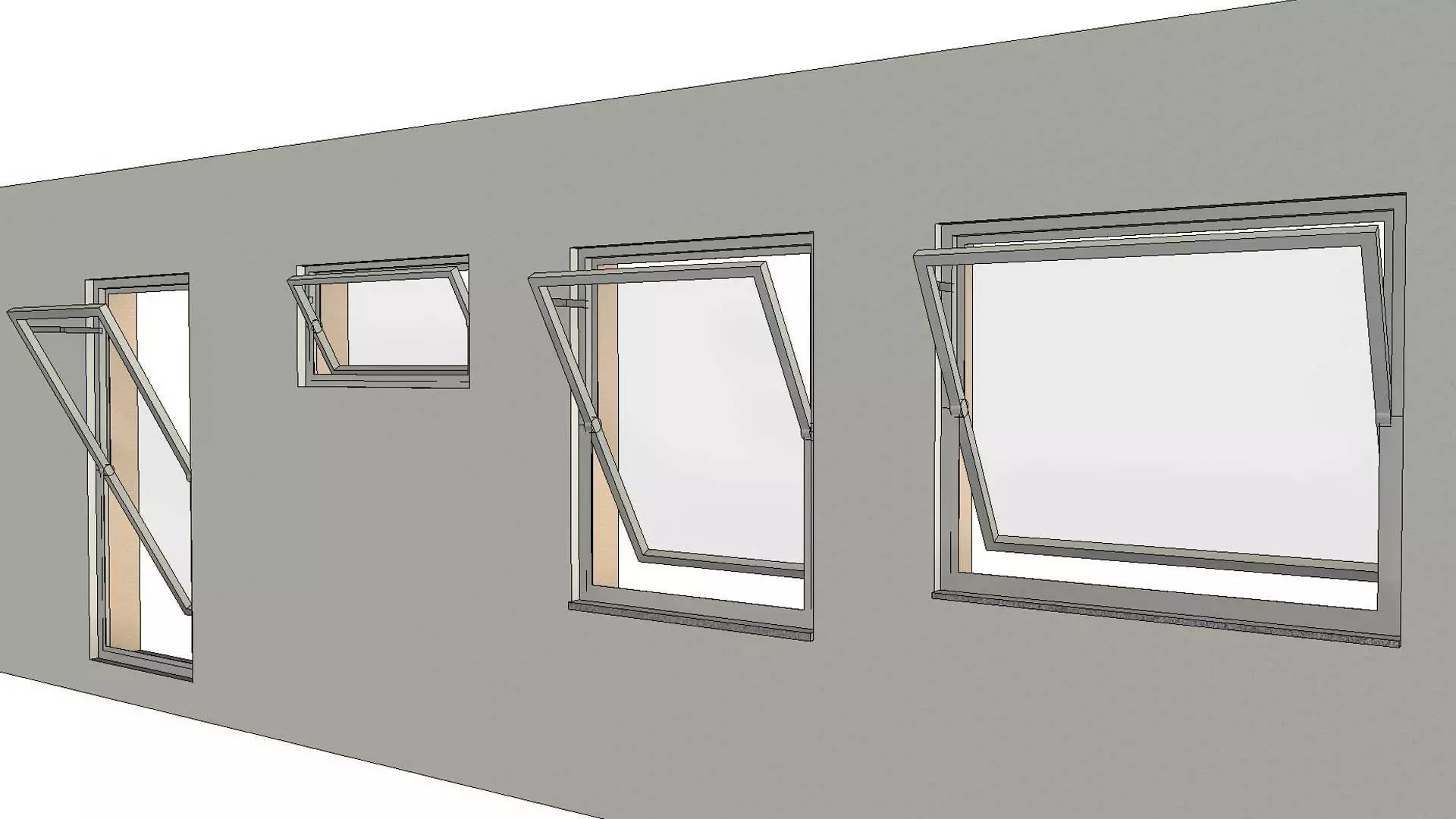 Fully Parametric Revit Family for a horizontal axis Pivot Window. Partially pivot opening window, 30degrees maximum opening with safety hinges.
