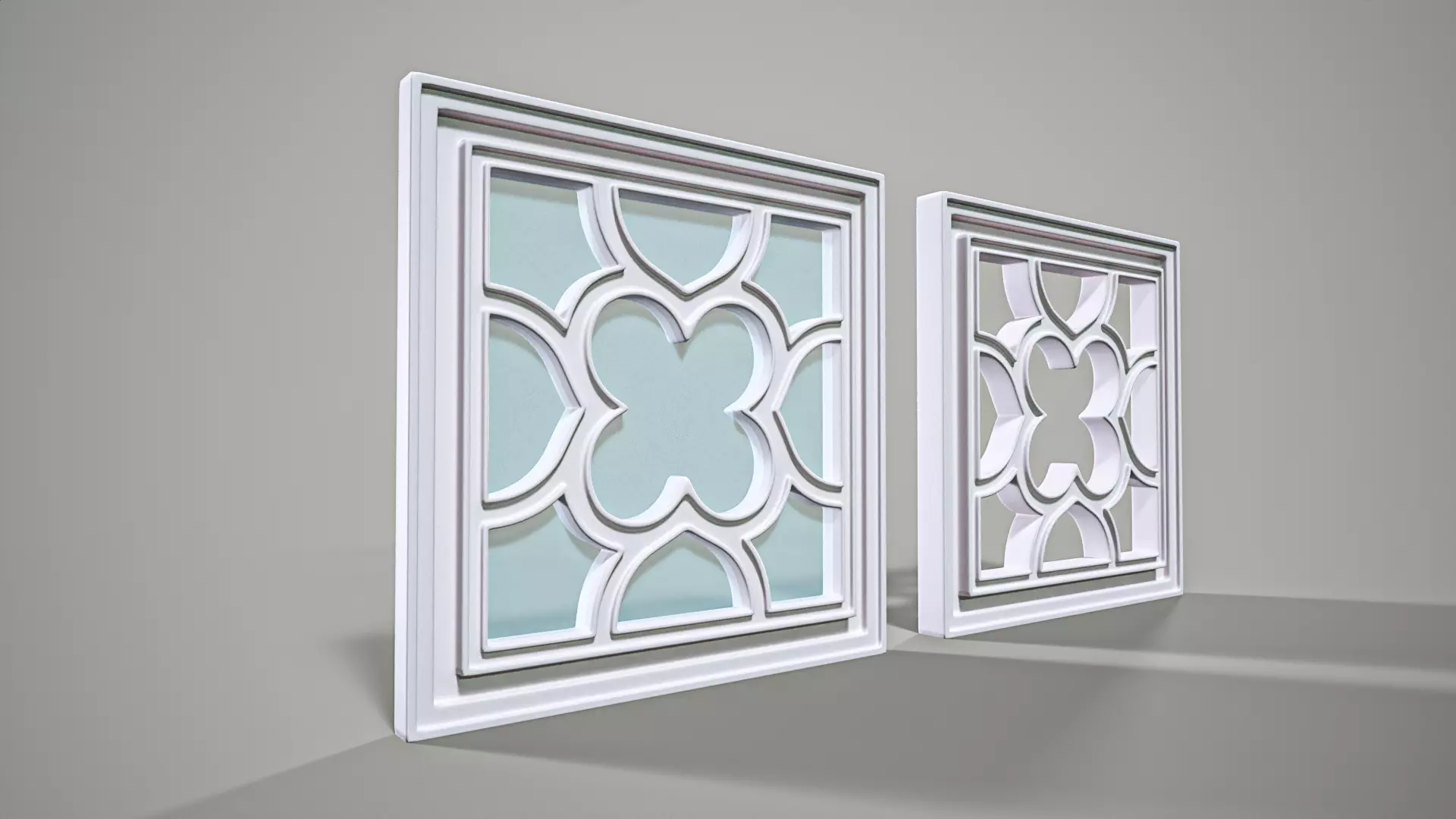 High poly, hard surface model of simple square Gothic window, with floral-like pattern formed by connecting circles. Dimensions 0.5x0.5 m. Subdivided with one iteration, ready for further subdivisions. 1st - model with double-sided glass. 2nd - empty frame