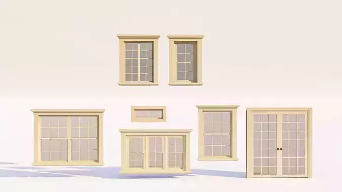 This is a high-quality 3D model pack of Traditional Hung Windows, designed for realistic residential architectural visualizations. These windows feature the classic vertical sliding sash mechanism and are modeled with accurate grid (muntin) patterns, making them ideal for suburban homes, historical restorations, and New Classical designs.