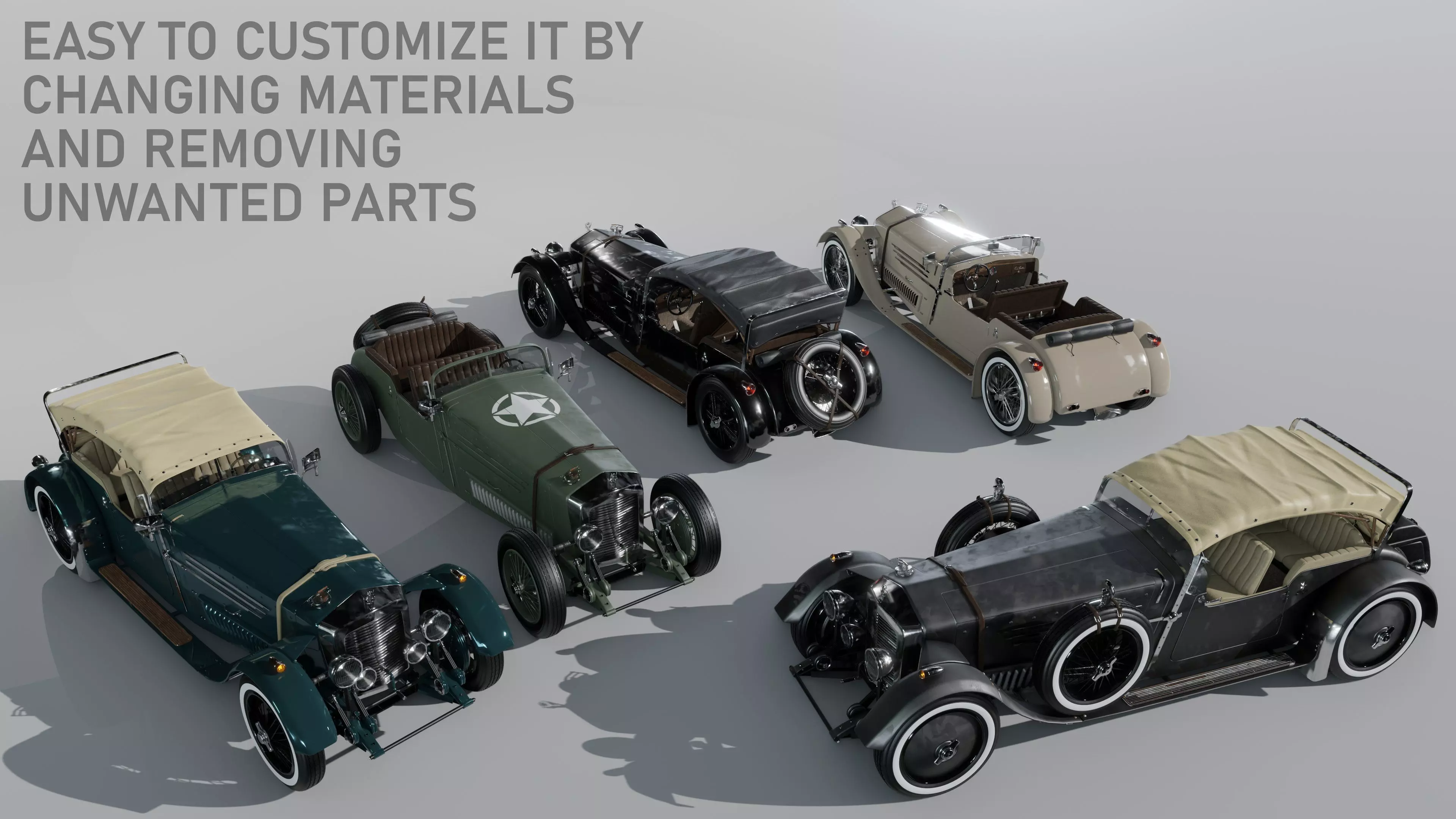 A Low-poly 3D model of a costomizable antique car made in Blender 3.0