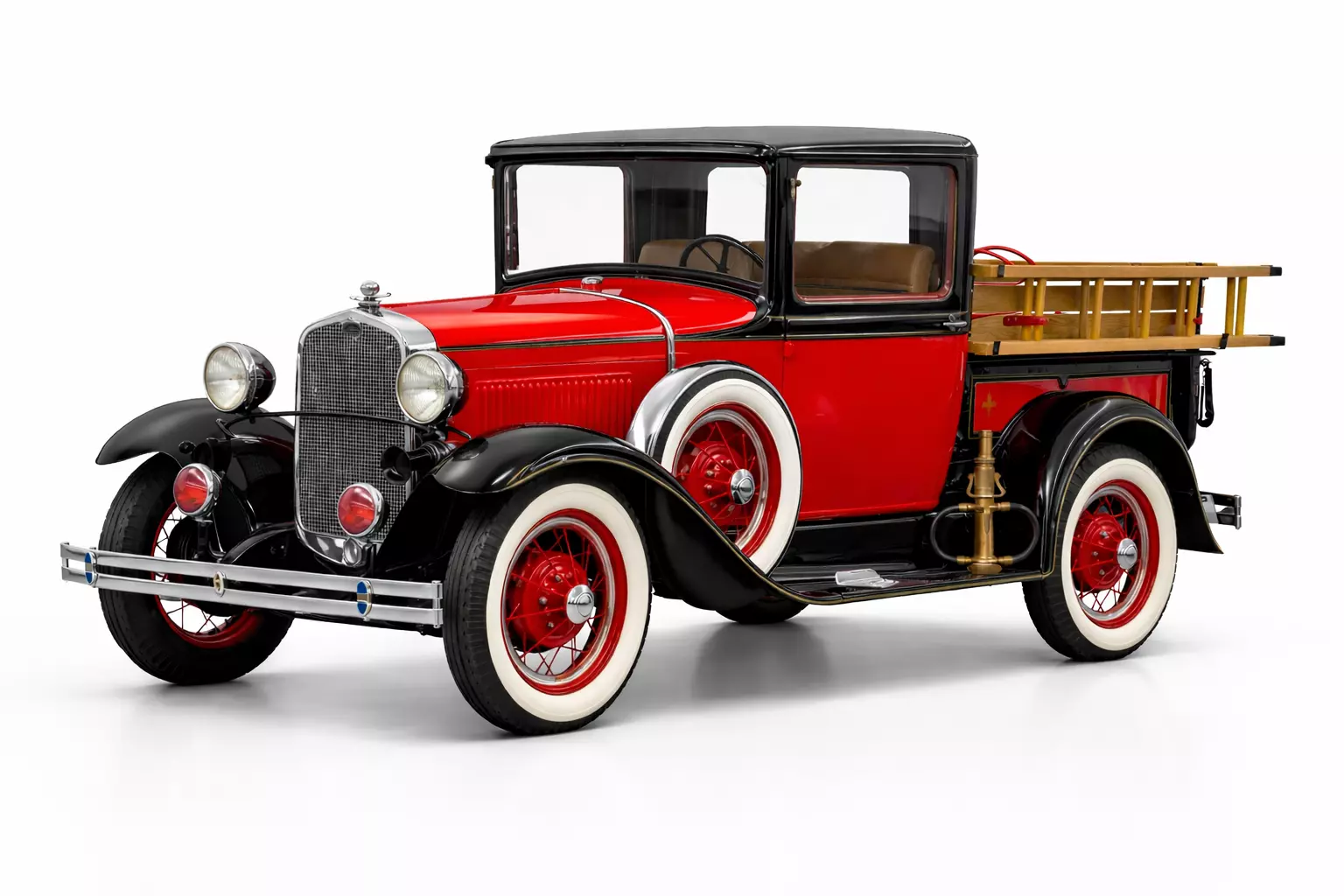 This 1930s early vintage fire pickup truck 3D model represents an antique historical emergency vehicle inspired by early firefighting and municipal service trucks.The model features period-correct proportions, rounded fenders, tall cabin design, simple ladder and equipment layout, and a classic pickup-based fire response structure, capturing the authentic character of early emergency vehicles.