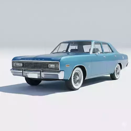 This is a high-quality 3D model capturing the distinctive look of a classic full-size sedan from the mid-1970s, reminiscent of models like the Chrysler Valiant, Dodge Polara, or Plymouth Fury. The model is presented in a bright blue finish, complete with classic features such as the large chrome bumpers, prominent grille, and period-correct white-wall tires mounted on wire-spoke-style hubcaps. The vehicle design features the long hood and boxy silhouette typical of the era. This asset is ideal for rendering realistic vintage scenes, integrating into video games with a 70s setting, creating detailed car animations, or for use in detailed historical architectural visualization projects. Attention has been paid to details like the antenna, side markers, and trim, making it a highly versatile and ready-to-render asset.