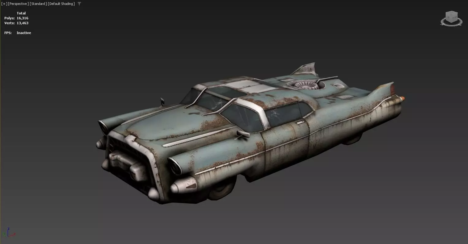 3D model of a vintage, rusted car with a futuristic design. The car has a worn-out, rusty texture, indicating age and neglect. The model appears to be displayed in a 3D modeling software, as indicated by the interface elements visible in the image. The car has distinctive features such as large fins at the rear, a jet engine-like component on the roof, and a bulky front grille. The text in the image provides details about the model: