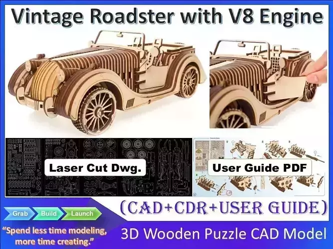 Bring the charm of classic motoring to life with this 3D wooden mechanical Roadster VM-01 model. Inspired by vintage cars of the 1930s–50s, this precision-cut wooden puzzle blends retro elegance with modern engineering. Each part is laser-cut from high-quality, eco-friendly plywood for a perfect fit. The model features functional steering, opening doors, and realistic mechanics. Assemble it without glue or tools and enjoy a smooth driving motion powered by mechanical transmission. A must-have collectible for car lovers, DIY builders, and design enthusiasts.Key Highlights:• Premium 3D wooden mechanical puzzle kit• Vintage-inspired design with modern detailing• Functional steering wheel and opening doors• Smooth-running transmission with moving parts• Laser-cut, eco-friendly plywood construction• No glue or special tools required for assembly• Includes CAD + CDR + illustrated instructions• Perfect for collectors, hobbyists, and kids