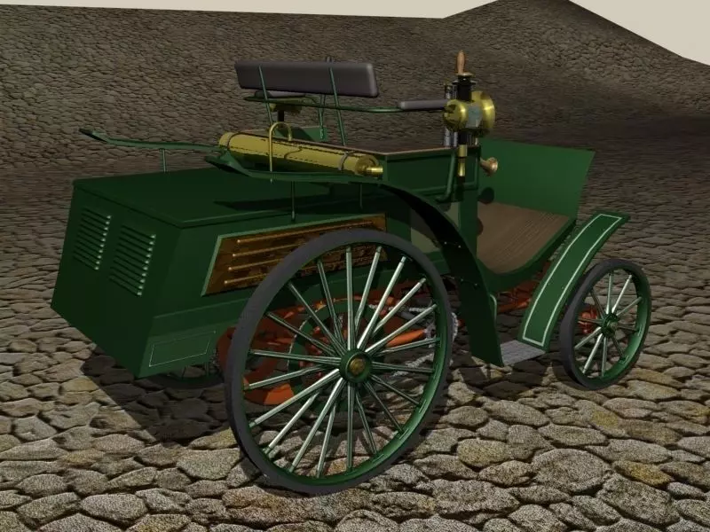Karl Benz sold 1200 of these cars between 1894 and 1902 for 2000 gold marks each. That was expensive in those days. It became the world's first car from large-scale production and at the same time the first small car. The car's top speed was 20 km/h. It was fitted with a wooden frame with iron reinforcements. It had compact dimensions and was 2.25 meters long. The first version of 1894 only weighed 280 kilograms. The wheelbase was 1,340 millimeters long; the track width was 1,000 millimeters at the front and 1,040 millimeters at the rear.There were numerous variations to the basic design. Some had solid spokes as shown in the model, while most of them came out with wire-spoke wheels with solid rubber tyres. The front wheels were 550 millimeters in diameter, and the back wheels were 850 millimeters in diameter. The step between the mudguards was more common on the Velo's successor, the 'Comfortable', but I did see some examples of this step on the Velo and so I included it on my model. I had to work from photos because there were no reliable blueprints available.