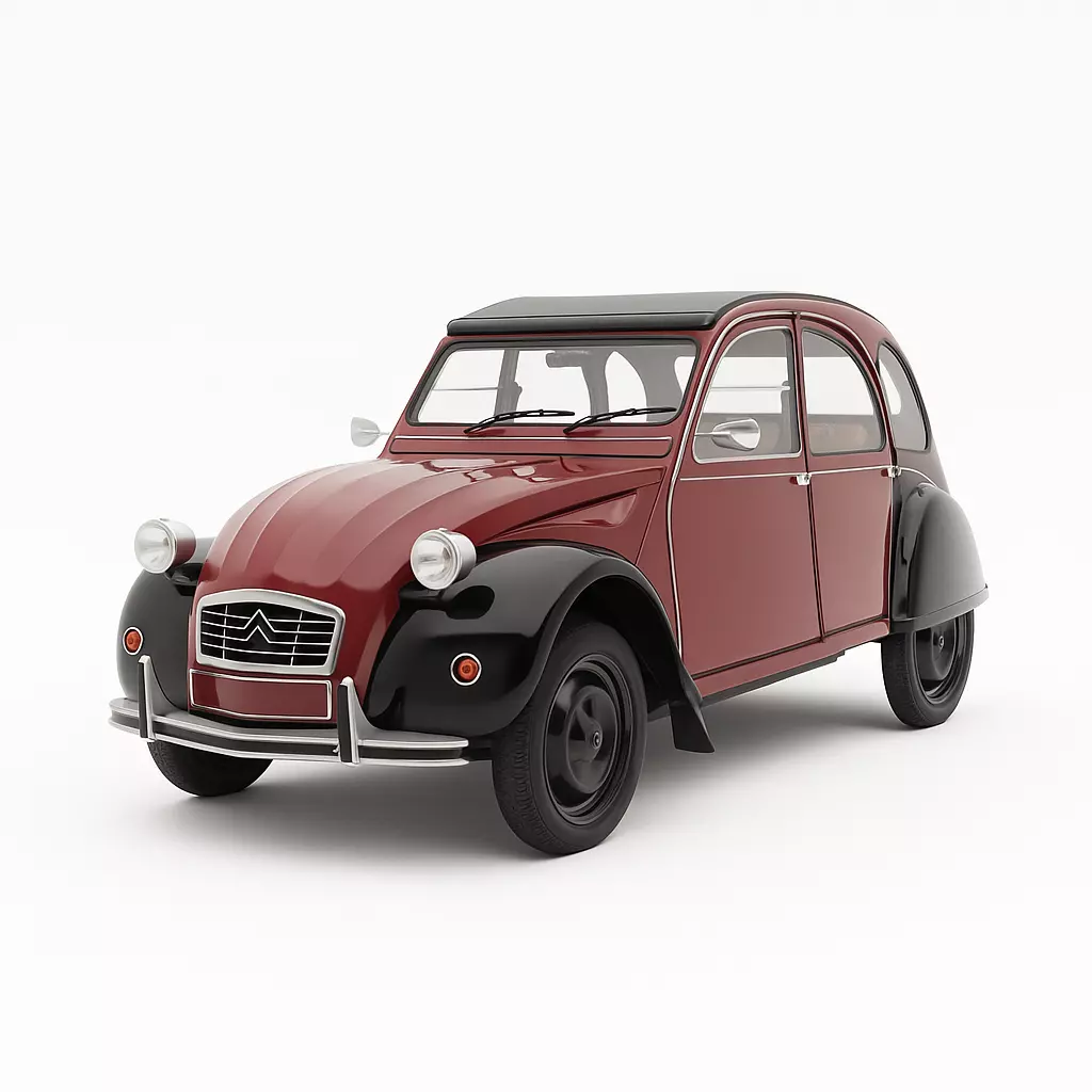 This is a detailed, realistic 3D model of the Classic Citroen 2CV, an iconic and beloved French economy car. The model accurately captures the vehicle's unique, instantly recognizable shape, including the distinctive high fenders, round headlamps, and corrugated hood detail. It is presented in a charming two-tone paint scheme, featuring a deep maroon or burgundy body paired with black fenders and a retractable soft top. Key features such as the removable soft-top roof and the minimalist grille are faithfully reproduced. This high-quality automotive asset is perfect for architectural visualization, vintage scene rendering, historical projects, or adding a touch of classic European charm to any digital environment.