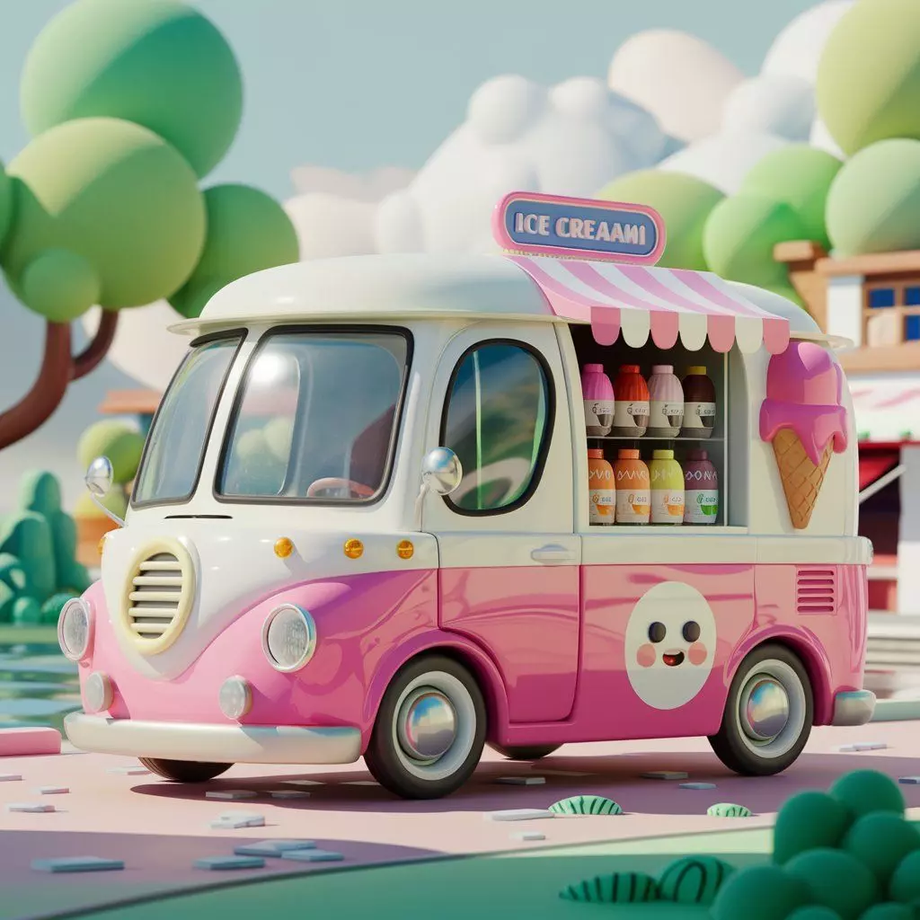 This is a highly stylized and adorable 3D model of a retro ice cream truck, perfect for use in animations, games, or cartoony environments. The model features a vintage design with a pink and white color scheme, rounded shapes, and charming details such as a large ice cream cone decoration on the side and a smiling face logo. The ice cream truck also has an open window with various ice cream bottles and flavors visible, adding realism to the scene.