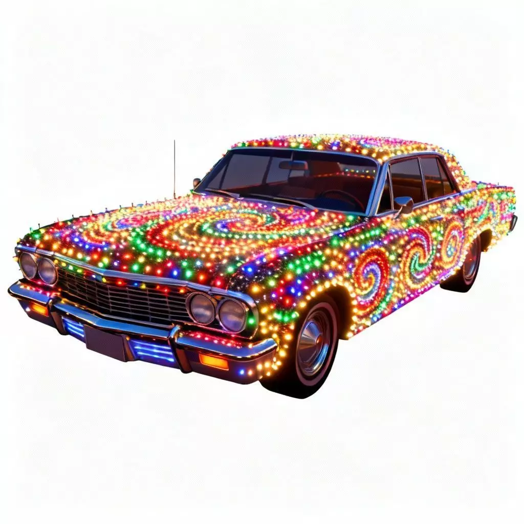 Hypnotic Swirl Patterns The lights aren't just placed randomly; they are arranged in artistic, psychedelic spirals. Large swirling circles of red, green, blue, and yellow lights cover the long hood and the side doors, drawing the player's eye instantly.