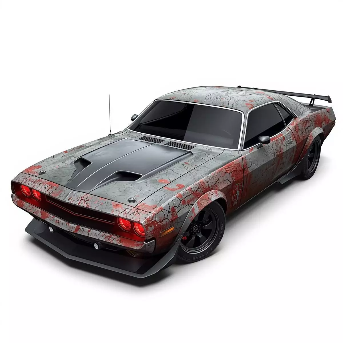 The model captures a professional level of macabre detail, from the cracked paint textures to the vintage black rims and heavy front splitter. Every element is meticulously crafted to ensure a polished yet haunting appearance, making it an ideal centerpiece for horror-themed racing games, cinematic renders, or spooky urban environment builds. Provided on an isolated white background, this haunted muscle car is ready to bring a sense of speed and dread to your creative projects.