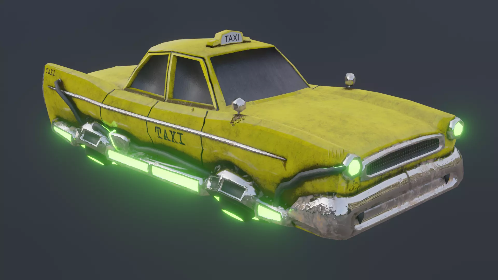 3d model of hovering historic taxi with futuristic feel. This model is inspired by Chevrolette Bel Air and typical yellow taxi from US. Its made for games with futuristic feel, but this model is one of vintage classic car.