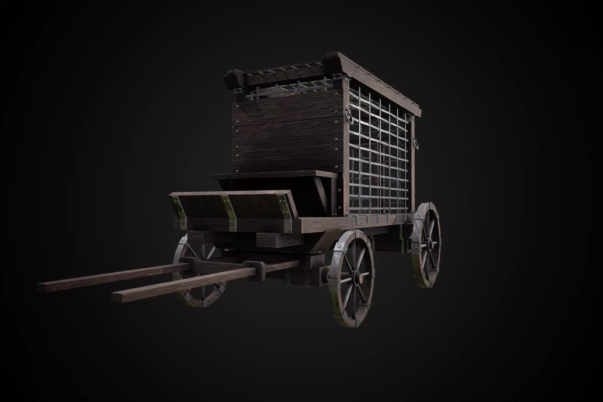 Realistic model of a medieval prisoner transport cart "Game ready lowpoly. It has been modeled in a real-world scale and is divided appropriately for animation. Vertex Count: 14532 All texture files are 4096x4096