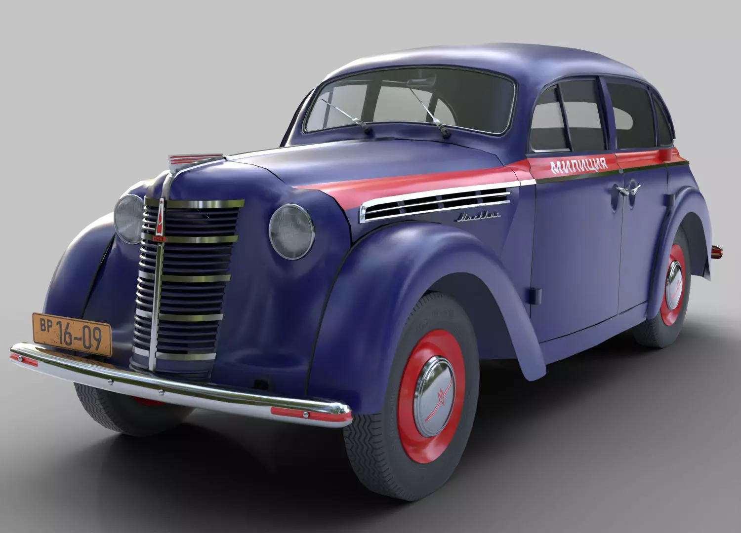 The Moskvich-400, the first Soviet automobile, captured the hearts of millions and became a true symbol of its era, embodying the dream of personal transportation for many Soviet citizens. It gave many Soviet citizens the opportunity to experience the world of personal mobility and feel part of progress. Although many of the car's technical solutions and design were borrowed from the German Opel Kadett, the Moskvich-400 was not a simple copy. It was adapted to Soviet operating conditions, became more reliable, and was easier to maintain. The Moskvich-400 left a lasting mark on the history of the Soviet automobile industry and in the memories of many generations. Today, these cars are true relics, collector's items, and symbols of an era when dreams of a personal car became reality.The low-poly 3D model was created in Blender, with the optimal renderer being Cycles. It is detailed enough for close-up visualization. Detailed textures are included. Texture resolution is 4096x4096 (jpg).WinRAR texture archive includes:• Base color• Normal map• Metallicity• Ambient occlusion• Roughness • Opacity