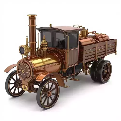 DescriptionA premium high quality 3D model of a heavy steampunk cargo truck featuring a robust Victorian industrial aesthetic. The vehicle is constructed with a weathered brass and iron chassis and features a prominent forward-mounted steam engine with a tall vertical exhaust chimney. Its design highlights complex mechanical detailing including exposed gears, pistons, and large copper pressure tanks mounted along the sides. The truck is equipped with a closed cockpit featuring dark smoked glass and a traditional wooden slat cargo bed at the rear. Presented as a full object isolated on a clean white background, this asset is ideal for heavy transport in industrial fantasy games or cinematic steampunk animations.