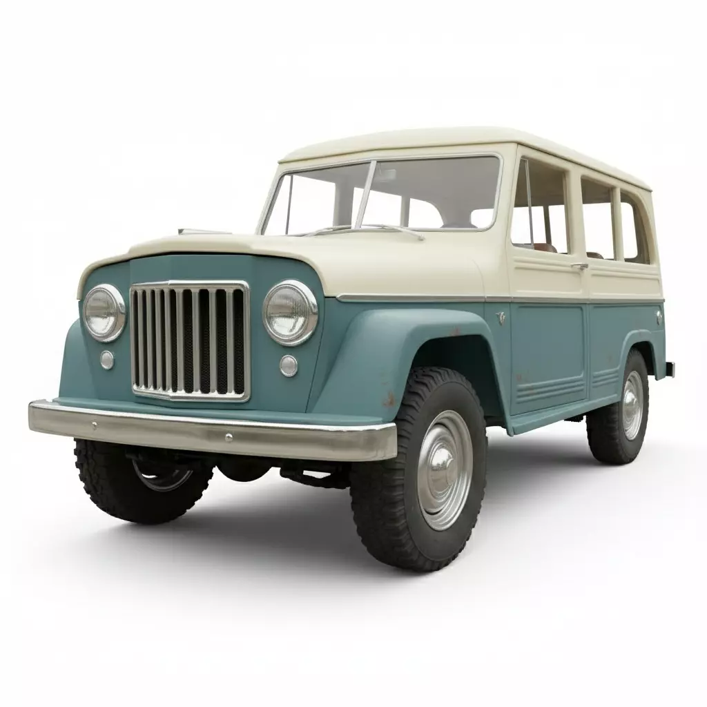 This is a high-quality 3D model of a classic, vintage utility wagon from the mid-20th century, reminiscent of the iconic Willys-Overland Station Wagon. The model features a distinctive two-tone paint scheme, with the main body in a patina-style teal/blue-green and the roof and hood in a cream/off-white. Details include a vertical-slat grille, prominent round headlamps, and chrome bumper accents. The model is presented with subtle signs of wear and rustic texturing, giving it an authentic, historical feel. This asset is perfect for scenes requiring a nostalgic family vehicle or an old-school off-road look in a game, visualization, or animated project.