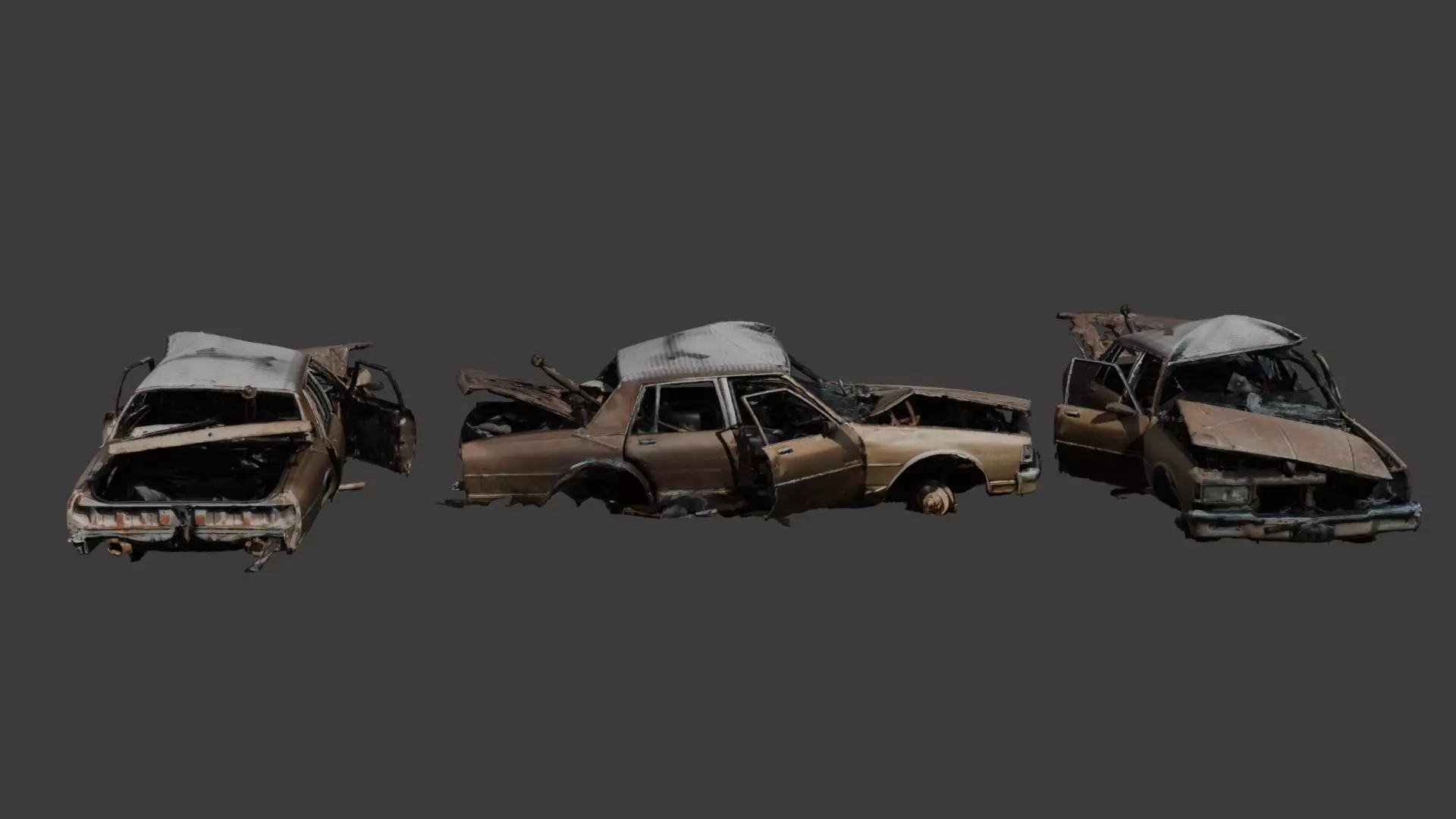 This pack includes 10 uniquely designed car models showing signs of extreme wear, rust, and damage—ideal for urban decay, war zones, crash scenes, survival games, and background props in open-world environments.