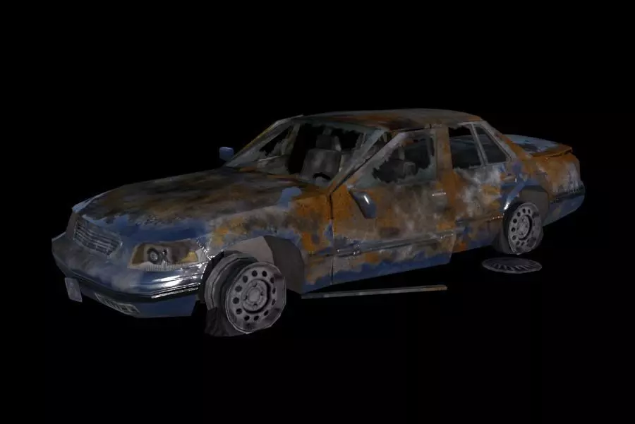 Low Polygon Count game ready model. Burnt out Sedan with interior.