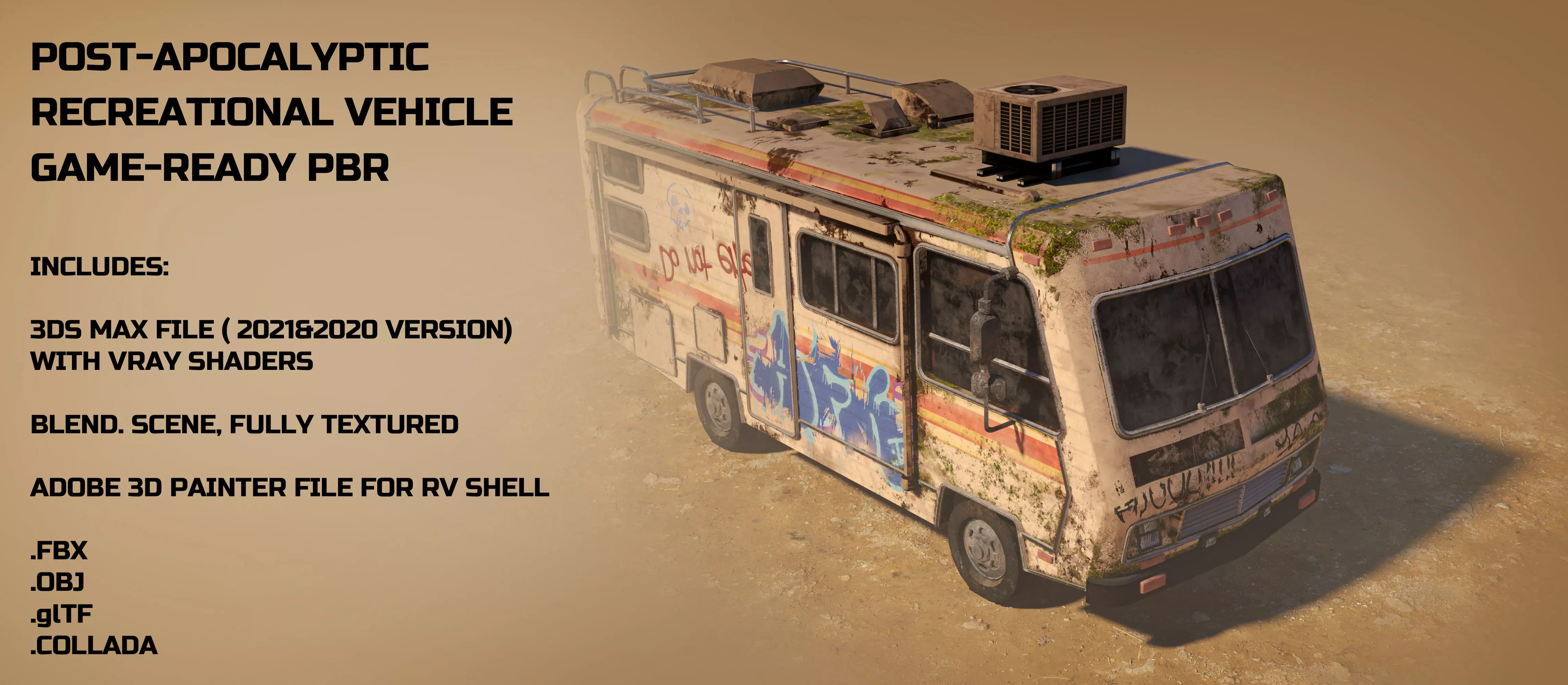 This is a game-ready fully optimized pbr rv van, ideal for your apocalyptic scenery, game levels and concept art! In the package you will find all the files you need, with 3ds max and blend files fully operational, with textures meshes.
