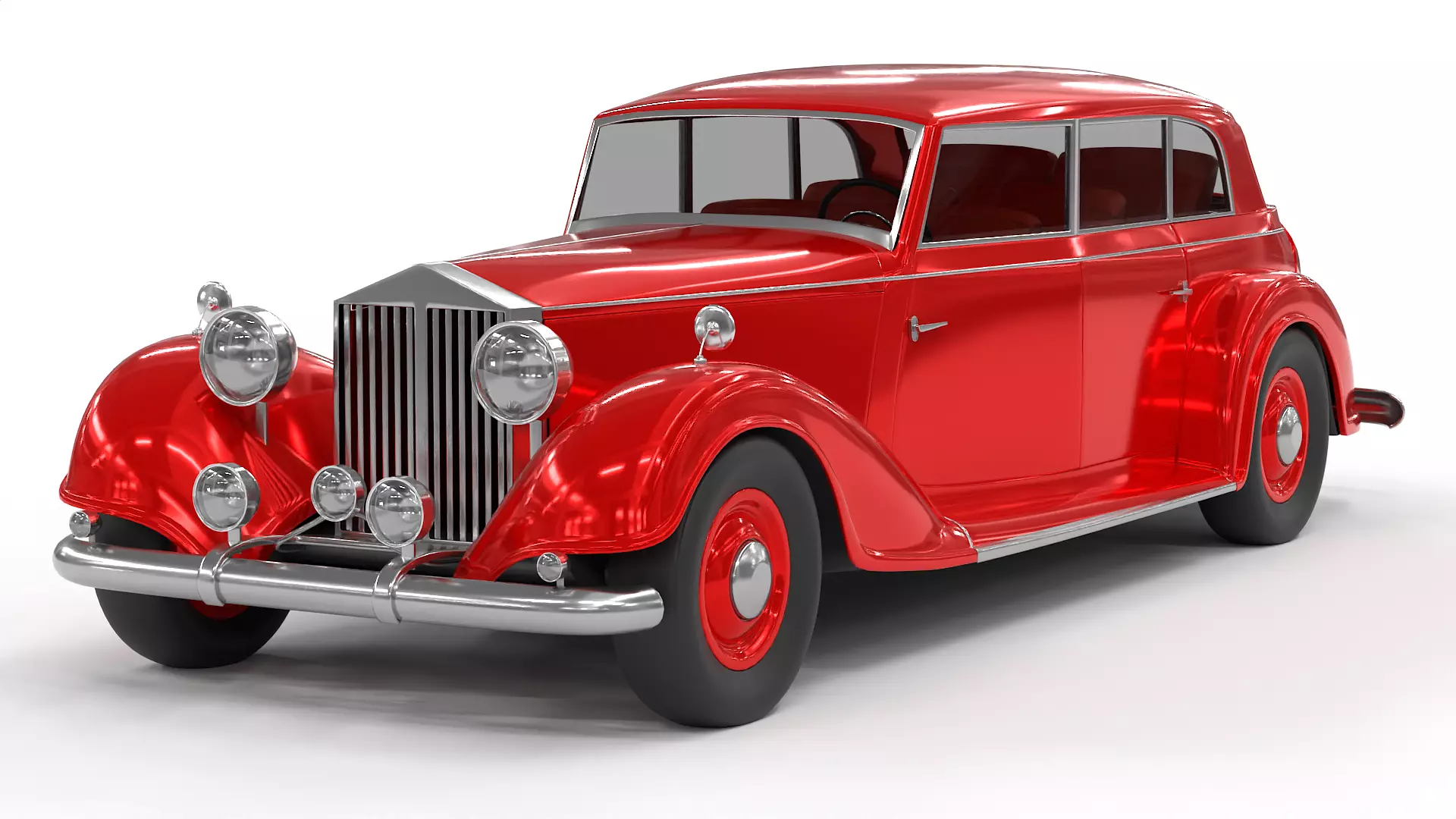 A vintage sedan car from the historical timeline, characterized by its boxy silhouette, vibrant red color, and leather interior, exuding a sense of luxury and sophistication.