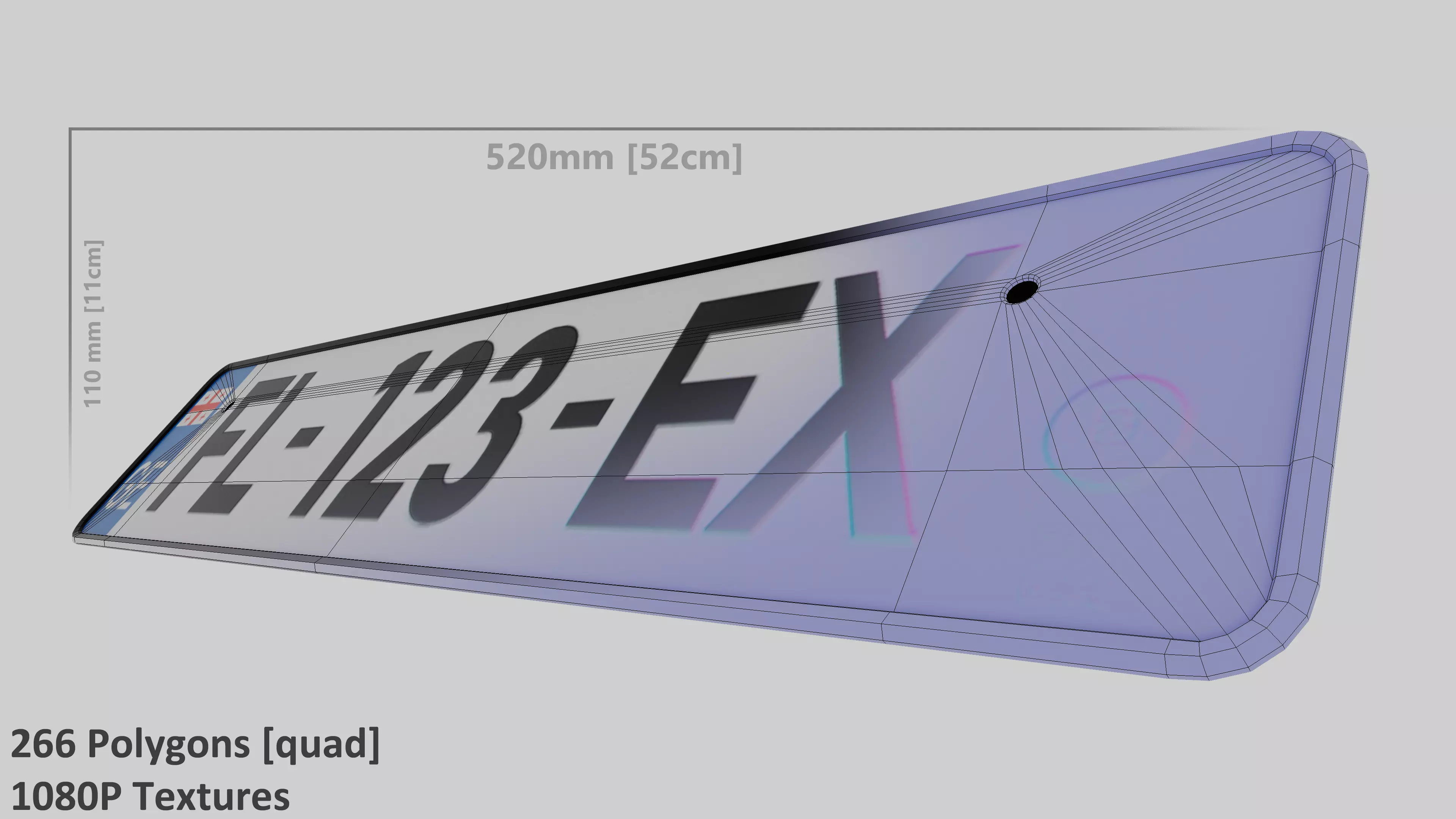 The license plate is based on Georgian (country) number plate dimensions, which follow EU standard dimensions both rectangle and square shape, This is also showcased in the preview images.