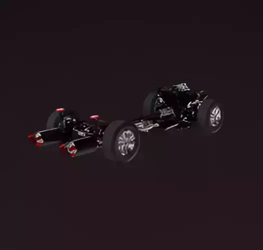 This is a top-down view of a car's chassis, isolated against a dark background. The image showcases the vehicle's essential mechanical components, including the wheels, suspension system, engine block, and a central driveshaft connecting the front and rear axles. The rendering highlights the intricate details of the automotive engineering, with visible black and metallic parts and subtle red and blue accents. The minimalist presentation focuses solely on the core structure, giving the impression of an engineering blueprint or a concept design.