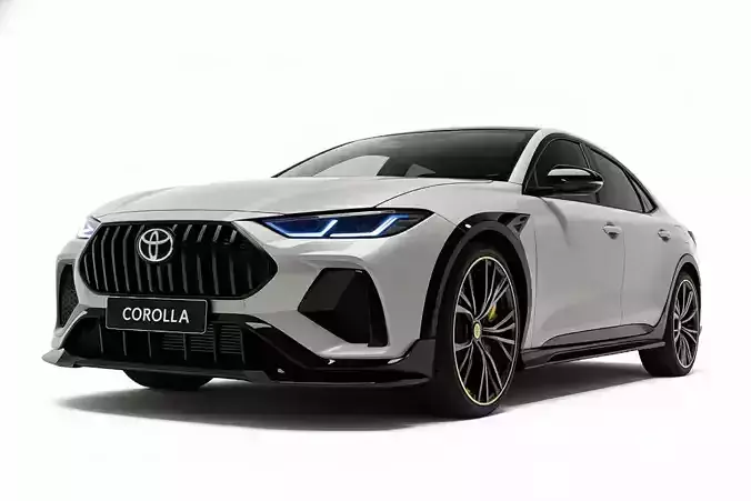 This is a highly aggressive and sporty 3D model render of a compact vehicle concept, appearing to be a high-performance or customized version, potentially based on the Toyota Corolla design language. The car features a striking satin white exterior with extensive gloss black accents on the aerodynamic body kit, wheel arches, mirrors, and roof. The front is dominated by a large, vertical mesh grille with the Toyota emblem and a license plate holder bearing the name COROLLA. Aggressive black lower bumper elements and a front splitter enhance its sporty stance. The multi-spoke black wheels with gold/bronze accents and visible calipers further emphasize the performance theme. This detailed 3D asset is ideal for automotive visualizations, game environments, or concept showcases focusing on modern street performance cars.
