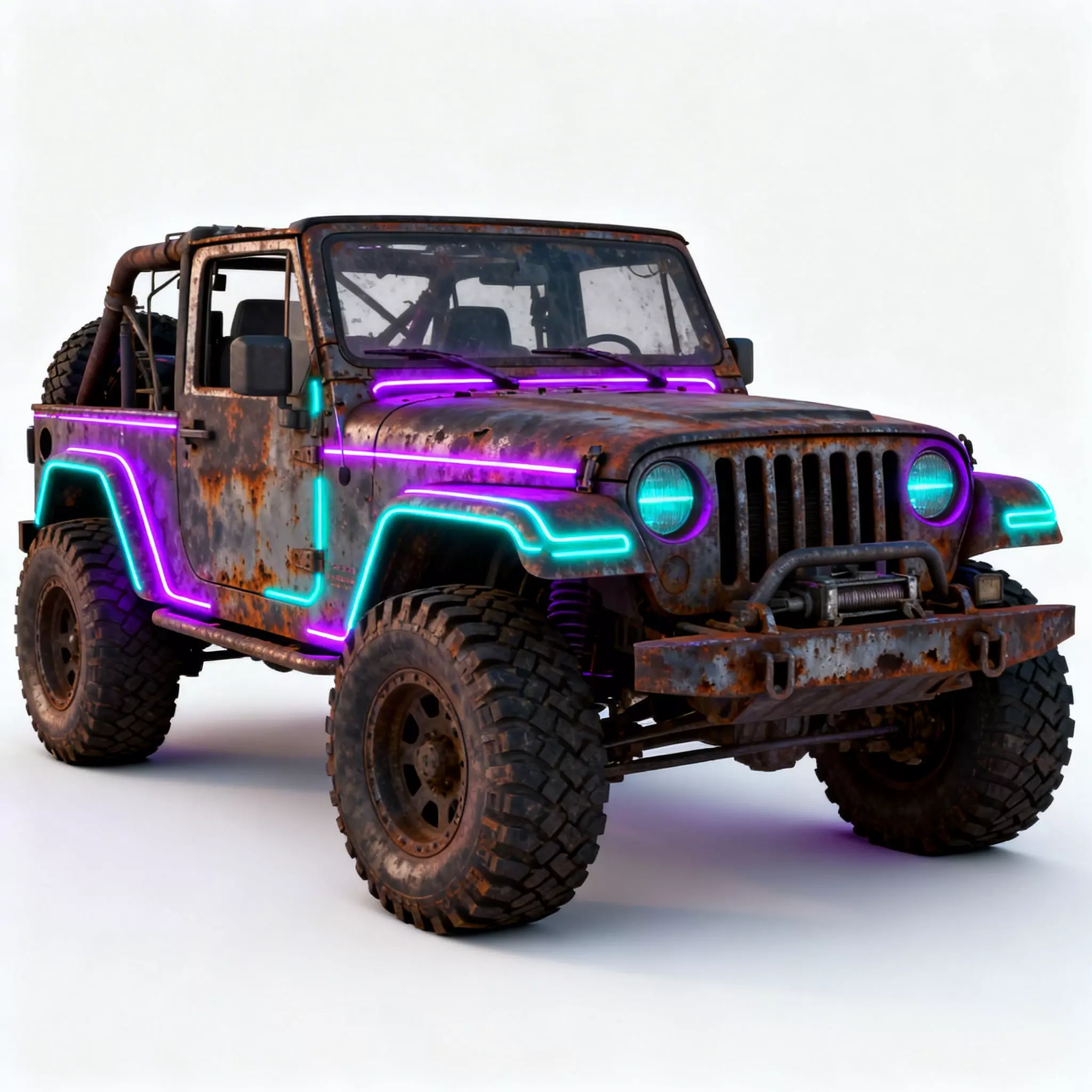 This striking 3D model presents a high-concept post-apocalyptic monster truck that blends rugged, weathered textures with futuristic neon aesthetics. The vehicle features a heavily corroded and rusted metal body, displaying realistic surface wear, dents, and oxidized textures that suggest a harsh desert or wasteland environment. Contrasting this decay are vibrant neon purple LED strips outlining the chassis, windows, and wheel wells, along with cyan-glowing lightning effects integrated into the headlights. Equipped with massive, deep-tread off-road tires and a heavy-duty suspension system, this model is a perfect centerpiece for cyberpunk, sci-fi, or survival-themed digital environments.