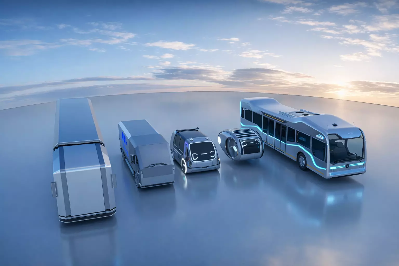 This futuristic mobility scene showcases a range of autonomous vehicles, including smart buses, delivery units, and modular transport pods.