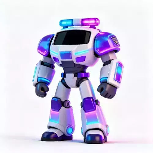 Tagsfuturistic, police mech, robot, pixar style, stylized character, neon, law enforcement, 3d model, game asset, scifi, iridescent, bold proportions, cyan, purple