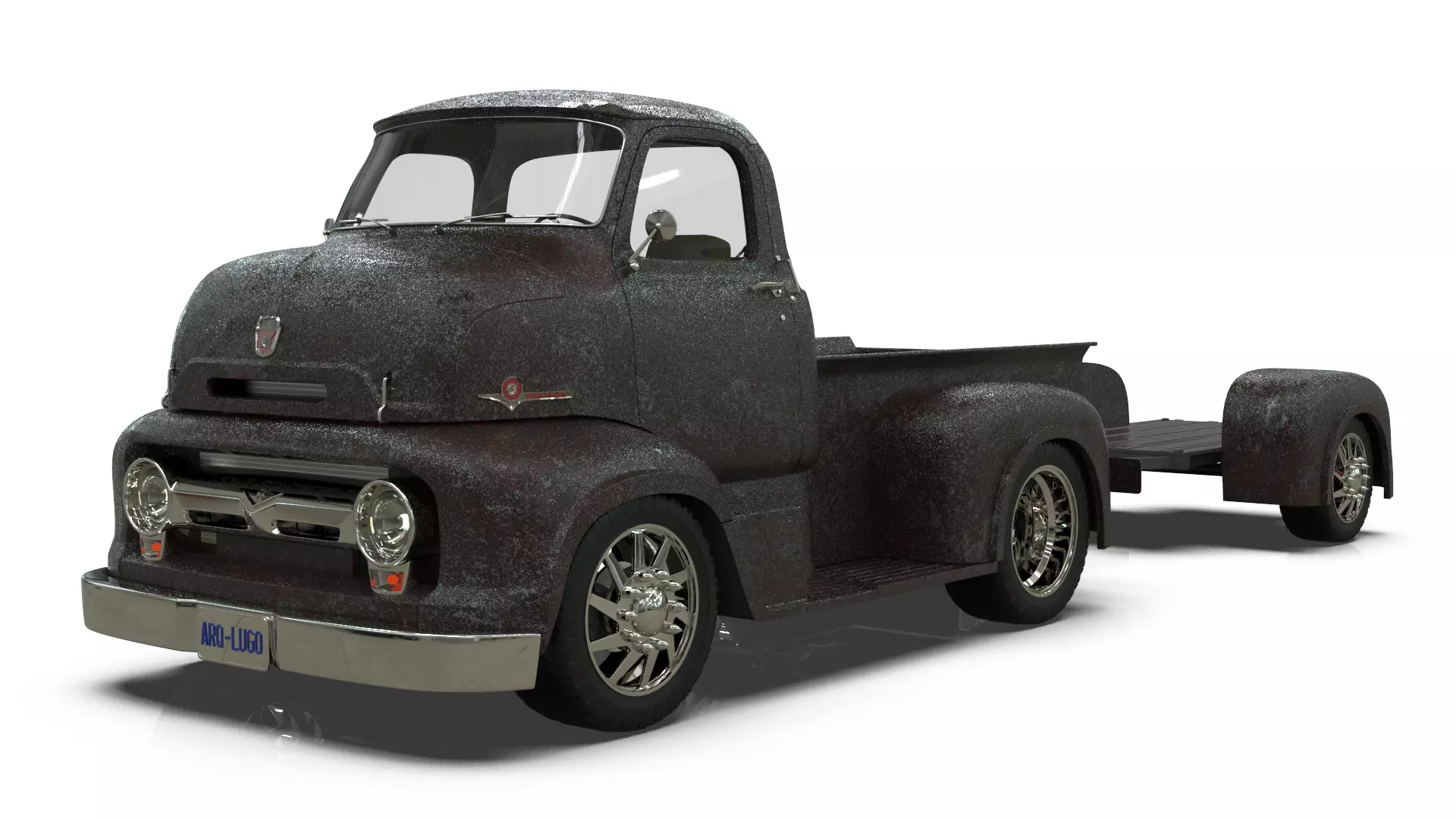 This unique 3D model showcases a vintage COE (Cab Over Engine) pickup truck inspired by the distinctive restoration style of renowned Mexican automotive artist Effi Muñiz. The asset includes both the main pickup truck and a matching motorcycle trailer, featuring the characteristic rusted metal paint finish that defines Effi's iconic work.
