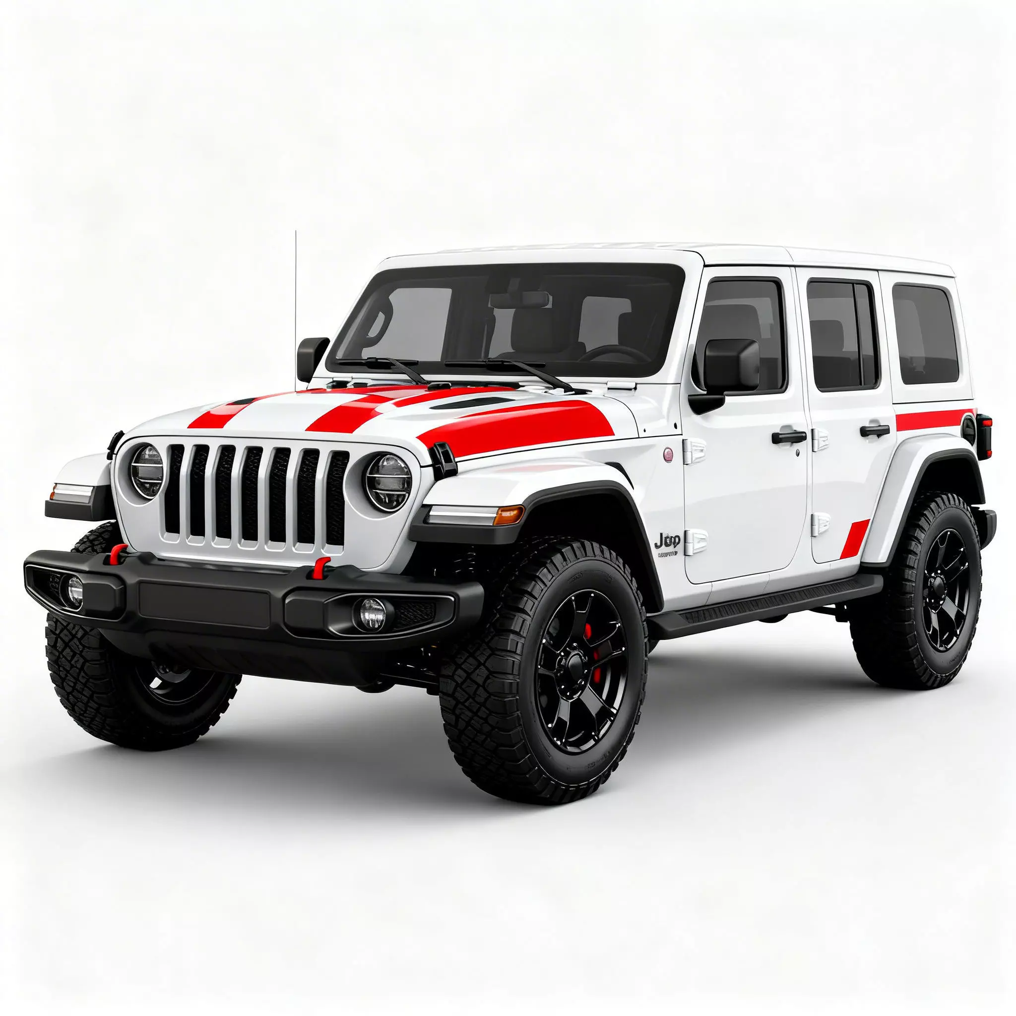 Tags3D model, off-road, jeep, 4x4, vehicle, automotive, white car, racing stripes, rugged, adventure, all-terrain, suv, transportation, digital asset, car render, realistic, black rims, tires, exterior, motor