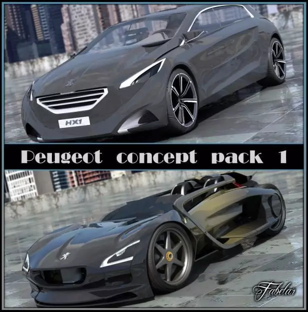 2 Peugeot concept cars collection. High detailed 3D models, rigged, 2 environments and lighting included, vray and standard materials versions.