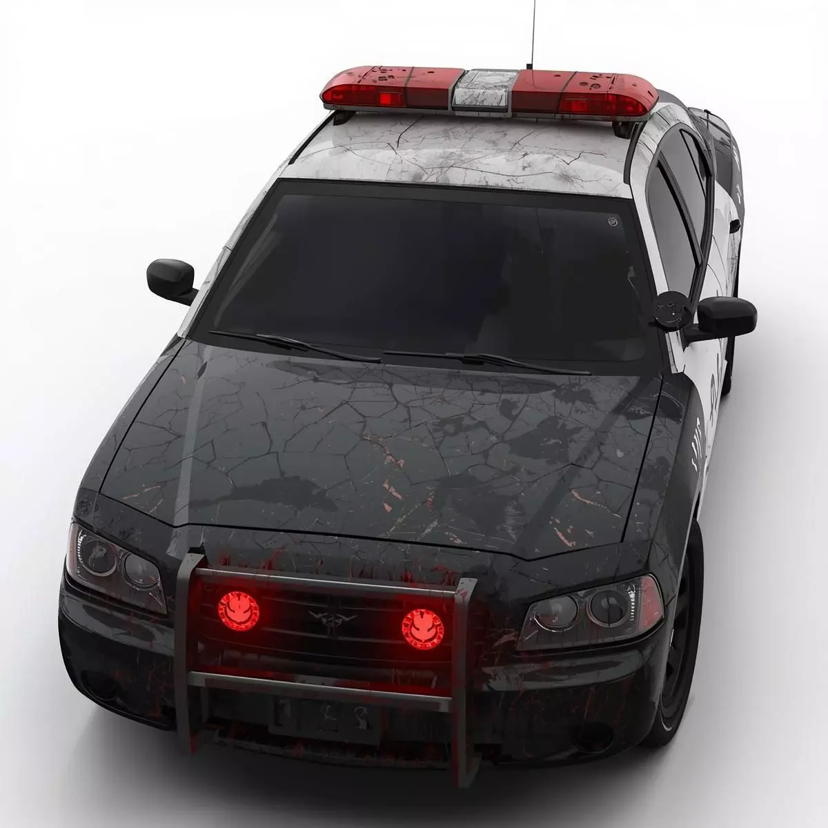 This high-quality 3D model features a menacing and highly detailed possessed modern police interceptor, designed with a dark cinematic horror aesthetic. The vehicle showcases a contemporary black and white patrol body, heavily weathered with realistic deep-set cracks across the hood and roof, accompanied by blood-red stains and splatters. A standout feature is the aggressive front profile, equipped with a heavy-duty steel brush guard and piercing, glowing red headlights and siren lights that simulate a demonic presence.