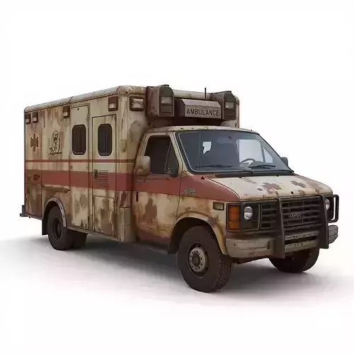 Tagsambulance, wasteland, rusted vehicle, 3D model, post-apocalyptic, emergency van, PBR textures, survival car, abandoned, game ready