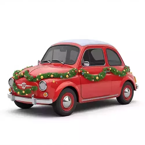 A festive high-resolution 3D cartoon-style car model featuring a vibrant red body and a snowy white roof. The asset is decorated with a dense green garland wrapped around the front and sides, adorned with colorful ornaments and integrated holiday lights. With its rounded silhouette and smooth glossy materials, this model is ideal for holiday-themed games, seasonal animations, or virtual winter environments. The car features fully opaque black windows and is presented as a full-body model isolated on a clean white background.